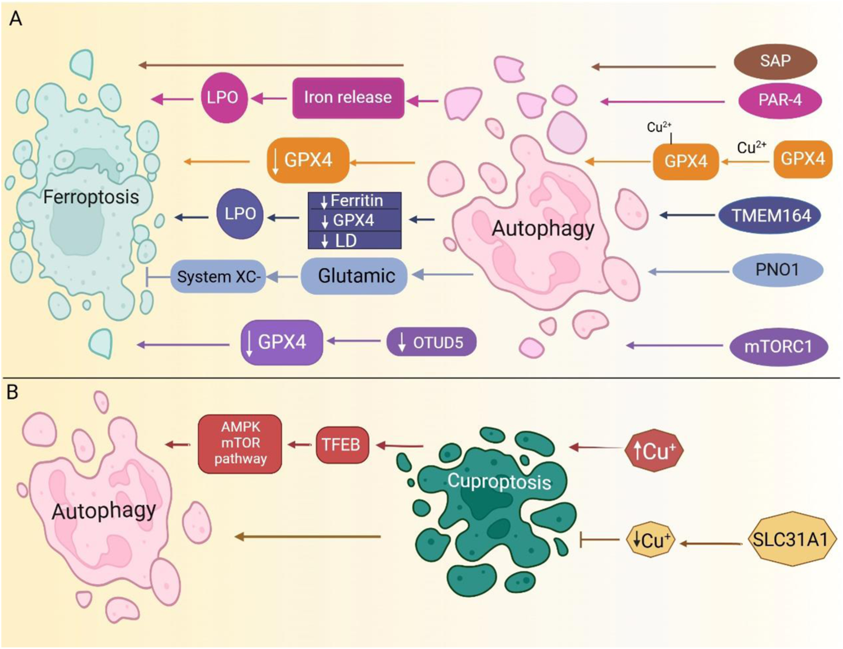 Autophagy serves as a key regulator of both ferroptosis and cuproptosis. (A). Several signaling pathways induce autophagy. PAR-4 upregulation triggers ferritinophagy, resulting in free iron release, increased lipid peroxidation (LPO), and ferroptosis induction. Additionally, mTORC1-mediated autophagy downregulates OTUD5, leading to GPX4 reduction and subsequent ferroptosis. SAP upregulation further enhances autophagy, driving ferroptosis. (B). Modulating copper uptake regulates autophagy pathways. For further details, please refer to the main text. (Routes are color-coded to indicate distinct pathways). SAP, severe acute pancreatitis; LPO, lipid peroxidation; PAR-4, Prostate apoptosis response-4; OTUD5, OTU deubiquitinase 5; mTORC1, mammalian target of rapamycin complex 1; LD, lipid droplets.