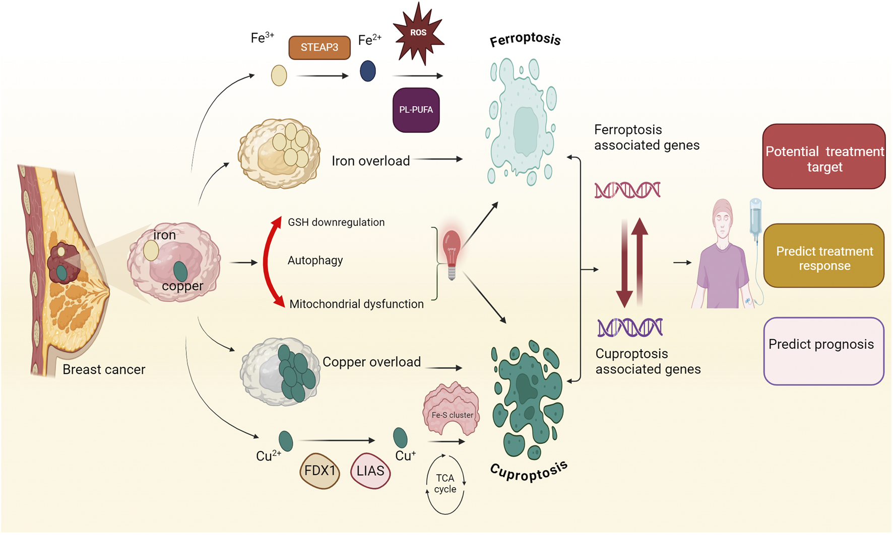 Iron and copper are central to diverse cellular death pathways, activating various mechanisms such as ferroptosis, cuproptosis, apoptosis, autophagy, necroptosis, and pyroptosis, each with unique pathways. Recent research highlights iron and copper as inducers of ferroptosis, while cuproptosis is a newly identified cell death mode specifically induced by copper (Hirschhorn and Stockwell, 2019; Tsvetkov et al., 2022). Therefore, manipulating cellular iron and copper homeostasis and targeting metabolic pathways could be potential strategies for treating breast cancer by inducing ferroptosis and cuproptosis. Exploring the convergence of iron and copper homeostasis may provide promising therapeutic avenues for breast cancer treatment.