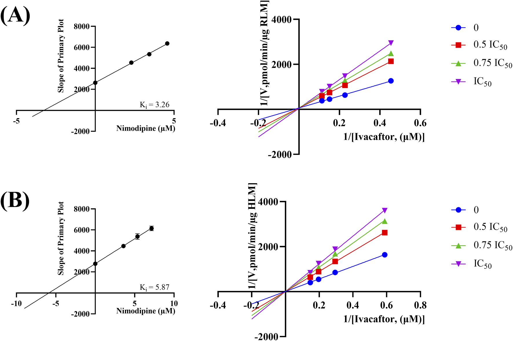 Lineweaver-burk plot, secondary diagram of Ki inhibiting ivacaftor metabolism at different concentrations of nimodipine in RLM (A) and in HLM (B).