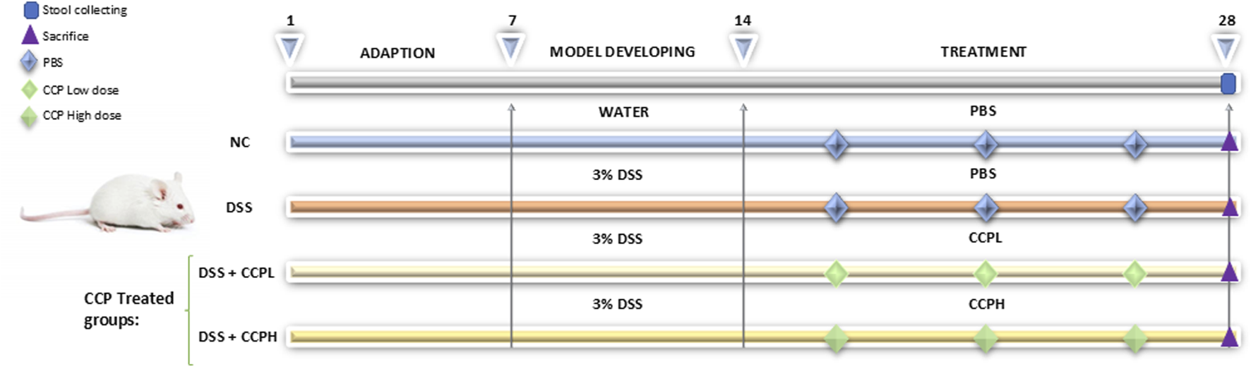 Schematic representation of the experimental design illustrating different steps at different time intervals in the study: the adaptation, the induction of colitis and treatment phases. The normal control group (NC, n = 8) was having access to normal water then administered PBS via gavage for the next 14 days. The colitis model (DSS, n = 8), low-dose treatment (CCPL, n = 8), and high-dose treatment (CCPH, n = 8) were administered 3% DSS in drinking water for 7 days to induce colitis. Following DSS treatment, the DSS group receive PBS by oral gavage for the next 14 days. The treatment groups CCPL and CCPH groups received low-dose and high-dose of CCP, respectively, by oral gavage for 14 days. Fecal samples were collected on day 28. Mice were euthanized on day 29.