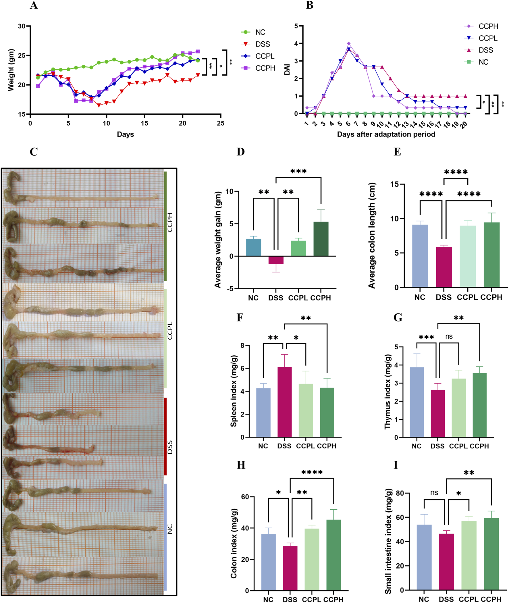 CCP alleviates colitis symptoms. (A) average weight change curves; (B) Disease Activity Index scores; (C) colon length; (D) Average weight gain; (E) Average colon length; (F) Spleen Index; (G) Thymus Index; (H) Colon Index; (I) Small intestine Index. Results: ns (not significant), *p < 0.05, **p < 0.01, ***p < 0.001; ****p < 0.0001.