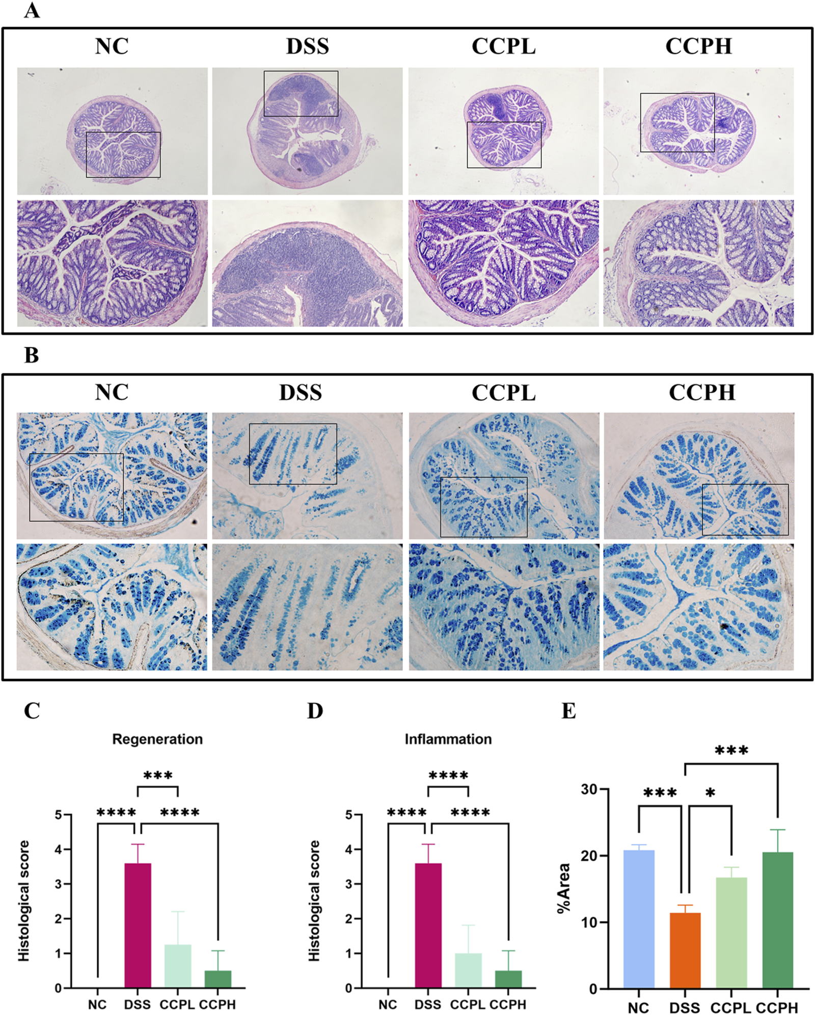 CCP alleviates DSS-histological damages in colon tissue. (A) Hematoxylin and Eosin (H&E) staining magnification (upper ×10) (lower ×20); (B) Alcian Blue staining (AB) staining indicates acid mucins secreted by goblet cells. Magnification: (upper ×10) (lower ×20); (C) Histological score (Regeneration); (D) Histological score (Inflammation); (E) Quantification Graph of AB staining. Results: *p < 0.05, ***p < 0.001; ****p < 0.0001.