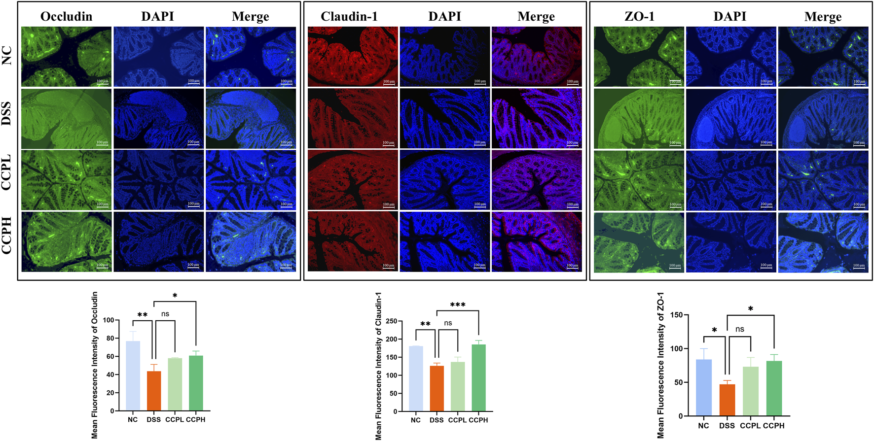 CCP enhances the expression level of tight junction proteins in colon tissue, as observed through Immunofluorescent (IF) analysis for Occludin, Claudin-1, and ZO-1 proteins at a magnification of ×20. And The Quantification Graph of each Immunofluorescent staining. Results: ns (not significant), *p < 0.05, **p < 0.01, ***p < 0.001.