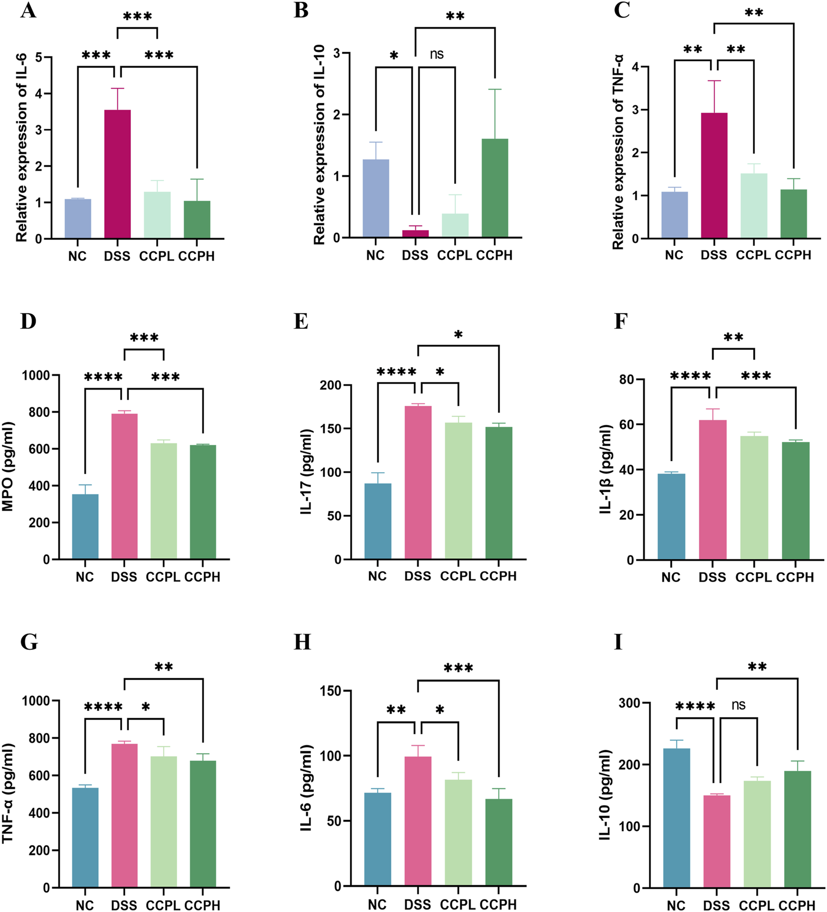 CCP Regulates the Balance of Pro-inflammatory and Anti-inflammatory Cytokine’s Expression and Secretion in Colon Tissue. Panels (A–C) show the mRNA expression levels of IL-6, IL-10, and TNF-α. Panels (D–I) display secretion levels (ELISA) of MPO, IL-17, IL-1β, TNF-α, IL-6, and IL-10. Results are presented as ns (not significant), * (p < 0.05), ** (p < 0.01), *** (p < 0.001), **** (p < 0.0001).