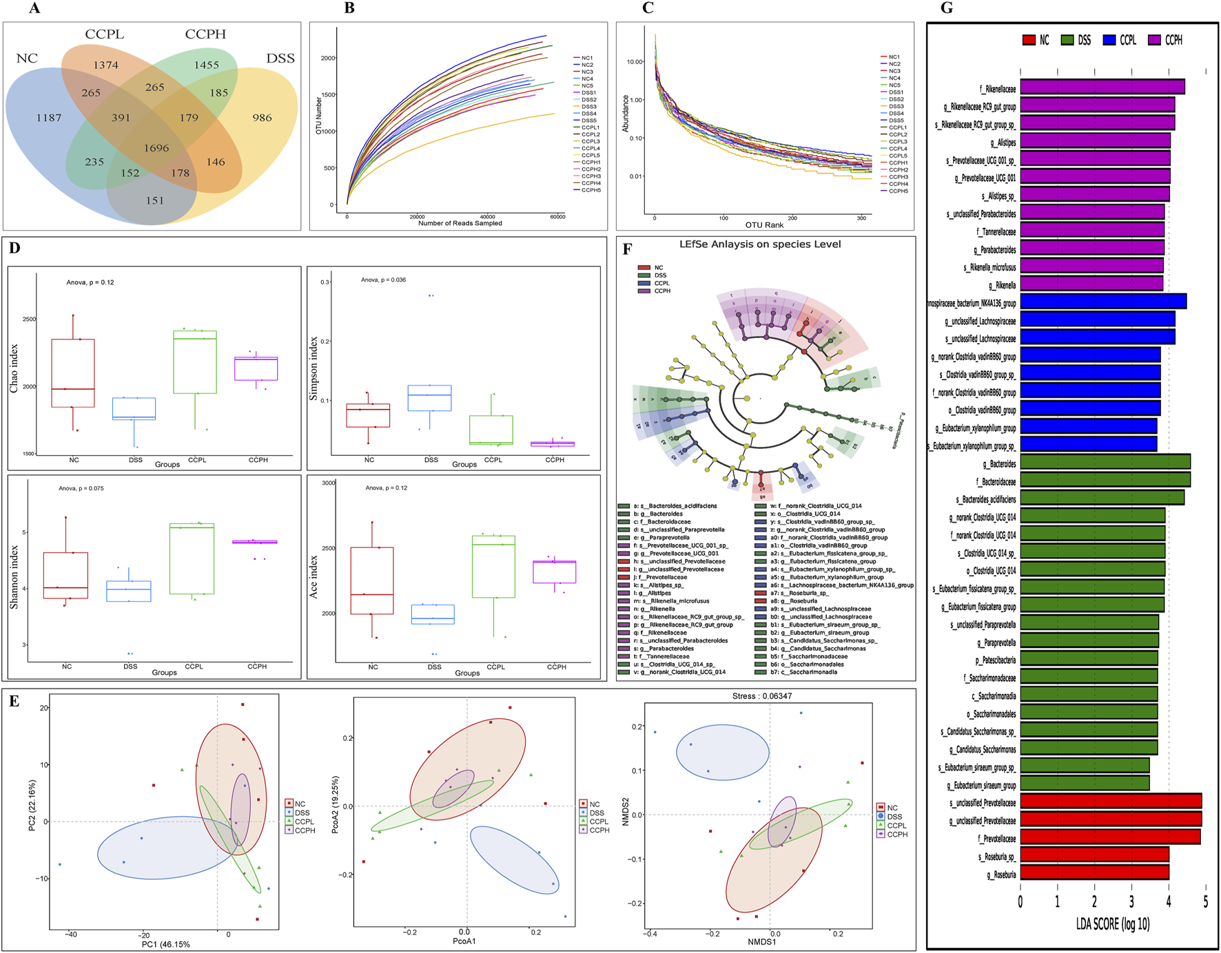 CCP alleviates the DSS-induced dysbiosis. (A) The Operational Taxonomic Units Venn diagram illustrating the shared OTUs across the different experimental; (B) Rarefaction curve Rank: gives an insight into the diversity within the samples; (C) Rank-abundance curve illustrating the relative abundance of microbial taxa across the different experimental groups; (D) Alpha diversity indices to assess richness, abundance, and diversity: Chao1, Simpson, Shannon and ACE indices; (E) Beta diversity evaluation to assess the microbial community structure across the groups. through Principal Coordinates Analysis (PCoA), Principal Component Analysis (PCA), and Non-metric Multidimensional Scaling (NMDS), (F) The cladogram of Linear Discriminant Analysis Effect Size (LEfSe) analysis; (G) Linear Discriminant Analysis (LDA) scores in differentially abundant taxa (LDA >4.0).