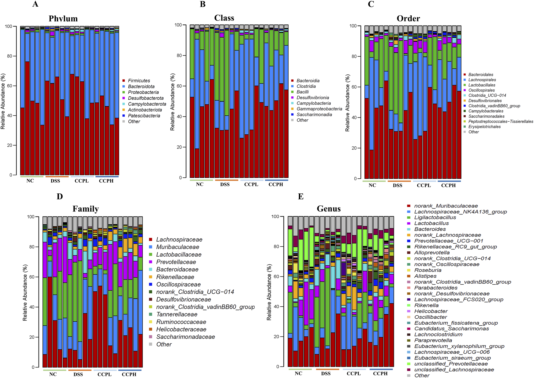 To explore the prebiotic effect of CCP on the composition and diversity of intestinal microbiota in a DSS-induced colitis mouse model. 16s rRNA sequencing was employed to analyze the V3-V4 region from the fecal samples. Venn diagram (Figure 8A) provides insight into the impact of disease and subsequent treatment CCP on the gut microbiome composition by analyzing the number of Operational Taxonomic Units (OTUs) unique to and shared between the study groups. The analysis revealed distinct patterns in group samples, the DSS group had the lowest number of unique OTUs (986) compared to NC (1,187) and the two treatments groups, CCPL and CCPH, suggesting a loss of microbial diversity in the model group. Furthermore, the analysis indicates that the CCPH group has a greater number of OTUs, 1,455, than the CCPL group, with 1,374 OTUs. Interestingly, the two treatment groups, CCPL and CCPH, displayed a greater overlap with the NC group compared to the overlap of the DSS and NC groups; this suggests that the microbial community of the treatment groups CCPL and CCPH is more similar to the normal control group. This may indicate an effective restoration of the gut microbiome towards a healthier state, potentially resembling the NC group. The OTU rarefaction (Figure 8B) and the Abundance rank curves (Figure 8C) provide insights into the alpha diversity and relative richness of the microbial communities across the groups. The rarefaction curves revealed that the NC group exhibited the highest number of observed OTUs and the greatest diversity among the three groups. In contrast, the DSS group displayed a distinct pattern with curves leveling off at a comparatively lower number of observed shared OTUs, indicating the lowest overall microbial diversity compared to the NC and CCP treated groups. However, both CCPH and CCPL samples showed higher rarefaction curves and greater OTU richness than the DSS group, indicating increased microbial diversity. Figure 8D results revealed that the DSS-treated group exhibited reduced species richness (Ace and Chao1 indices) and diversity (Shannon and Simpson indices) compared to the normal group, indicative of gut microbiome dysbiosis with decreased bacterial abundance and diversity in the model group. However, the supplementation of CCP showed significant changes in the microbiome composition, CCPL group’s noticeable trend towards increased Simpson, Shannon, Chao1, and Ace indices was observed. Also, the CCPH group showed a significant increase in Chao 1 and Ace indices compared to the DSS group, these results indicate that CCP supplementation reversed the DSS-induced dysbiosis by restoring the Alpha diversity indices (Figure 8D). A significant increase is observed in the Shannon Index, demonstrating a significant restoration of diversity in CCPH. In summary, these findings demonstrate that the DSS-induced colitis model significantly disrupts gut microbiome diversity and richness. Nevertheless, treatment with CCP appears to restore these alpha diversity parameters in a dose-dependent manner. Beta diversity analysis was employed to characterize the gut microbiome structure and to reveal compositional similarities or dissimilarities between the experiment groups. To further evaluate the prebiotic potential effect of CCP on DSS-induced dysbiosis, the Beta diversity parameters including Principal Coordinates Analysis (PCoA) with weighted UniFrac distance, Principal Component Analysis (PCA), and Non-Metric Multidimensional Scaling (NMDS) were analyzed (Figure 8E). The results demonstrate that the four different groups (NC, DSS, CCPL, and CCPH) are visibly separated from each other. The PCoA plot analysis shows the DSS group positioned separately from the NC group; this latter is also positioned separately from the other three groups, suggesting that the microbial profile of the normal control is distinct from the colitis model and the two treatment groups (CCPL and CCPH), it also implies that the microbial community composition is most altered in the disease model compared to the normal control indicating a significant impact of DSS-induced colitis on the gut microbiota. However, the profiles of the treated groups, CCPL and CCPH, are positioned closer to each other than to the DSS group, indicating that the microbial profiles of these two groups are more similar to each other than to the disease model and show a partial shift towards the control group, suggesting the ability of CCP to restore a healthier gut microbiota. Importantly, the PCA plot and NMDS reinforce the observations from PCoA, depicting distinct clusters for each group.