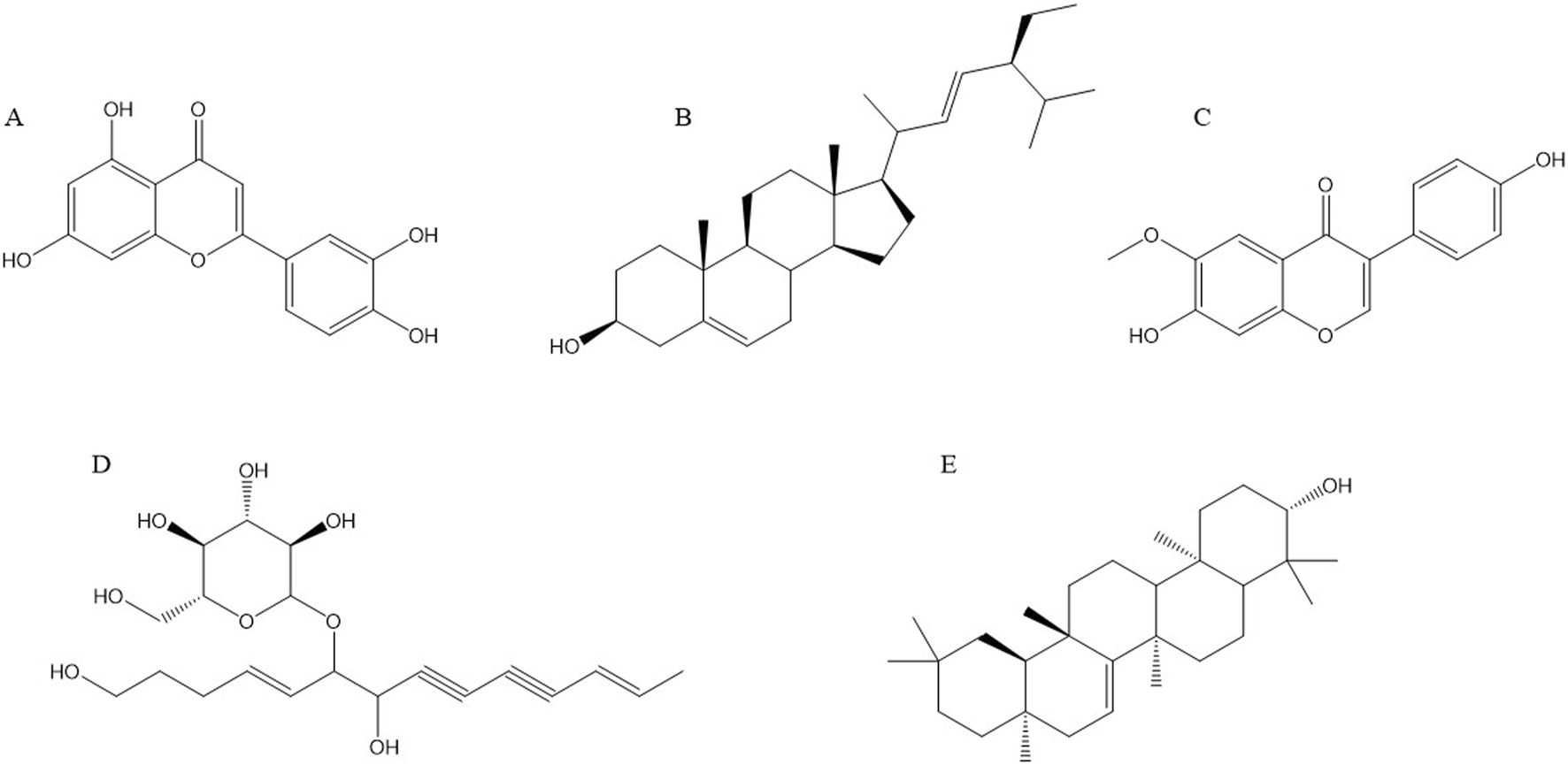 Figure 3. Structural formulae of representative compounds: (A) Luteolin, (B) Stigmasterol, (C) Glycitein, (D) Lobetyolin, (E) Taraxerol.