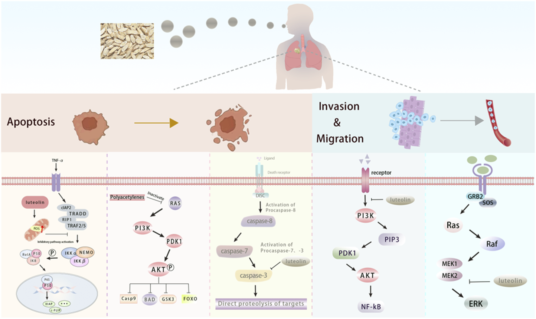 Figure 5. The active components of Radix Codonopsis promote lung cancer cell death and inhibitinvasion and metastasis. luteolin and Polyacetylenes can promote the apoptosis of lung cancercells by inhibiting PI3K/AKT, NF-kB and Caspase pathways. luteolin also attenuated EMT byinhibiting PI3K/AKT/NF-kB pathway and activating MEK/RK signaling pathway.