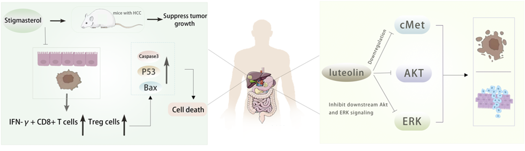 Figure 6. The active ingredients of Radix Codonopsis exert anticancer effects in gastric and livercancer. Stigmasterol was shown to inhibit tumor growth in mice. It was found that theincrease of IFN-y+ CD8+ T cells and Treg cells and the upregulation of Caspase3, Bax and P53 expression led to the death of tumor cells. luteolin can inhibit the proliferation, invasionand promote apoptosis of gastric cancer cells by inhibiting cMet/Akt/ERK signaling pathway.