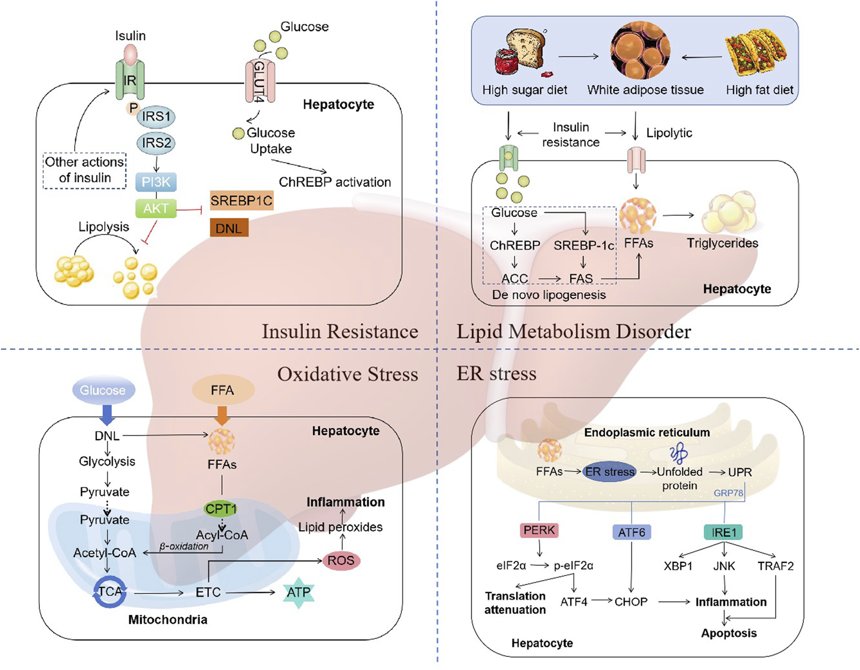 The molecular mechanism of IR refers to the impairment of the appropriate downstream effects of insulin signaling in target tissues, such as the liver, muscle, and adipose tissue. Insulin exerts its effects on all cells by binding to its specific receptor, thereby initiating a cascade of intracellular signaling (Khan et al., 2019). Upon insulin binding, the insulin receptor phosphorylates itself and several members of the insulin receptor substrate (IRS) family. The typical IRS signalling pathways include those that are dependent on IRS1 or IRS2, which utilise the activities of phosphatidylinositol 3-kinase (PI3K), phosphoinositide-dependent kinase (PDK) and protein kinase B (AKT), as well as the RAS-extracellular-signal regulated kinase (ERK) pathway (Eckstein et al., 2017). Activation of IRS2 has been demonstrated to function as a regulator of sterol regulatory element binding protein 1c (SREBP-1c), thereby influencing de novo lipogenesis (DNL) (Schreuder et al., 2008). In states of IR, there is a reduction in the expression of IRS-2, which results in an increase in the expression of SREBP-1c and a corresponding elevation in the rate of DNL (Stefan et al., 2008). Additionally, the β-oxidation of FFAs is suppressed in states of insulin resistance, thereby further promoting the accumulation of hepatic lipids (Postic and Girard, 2008). Thus, disorders of lipid metabolism due to dysregulation of insulin signalling are key factors in the development and progression of NAFLD.