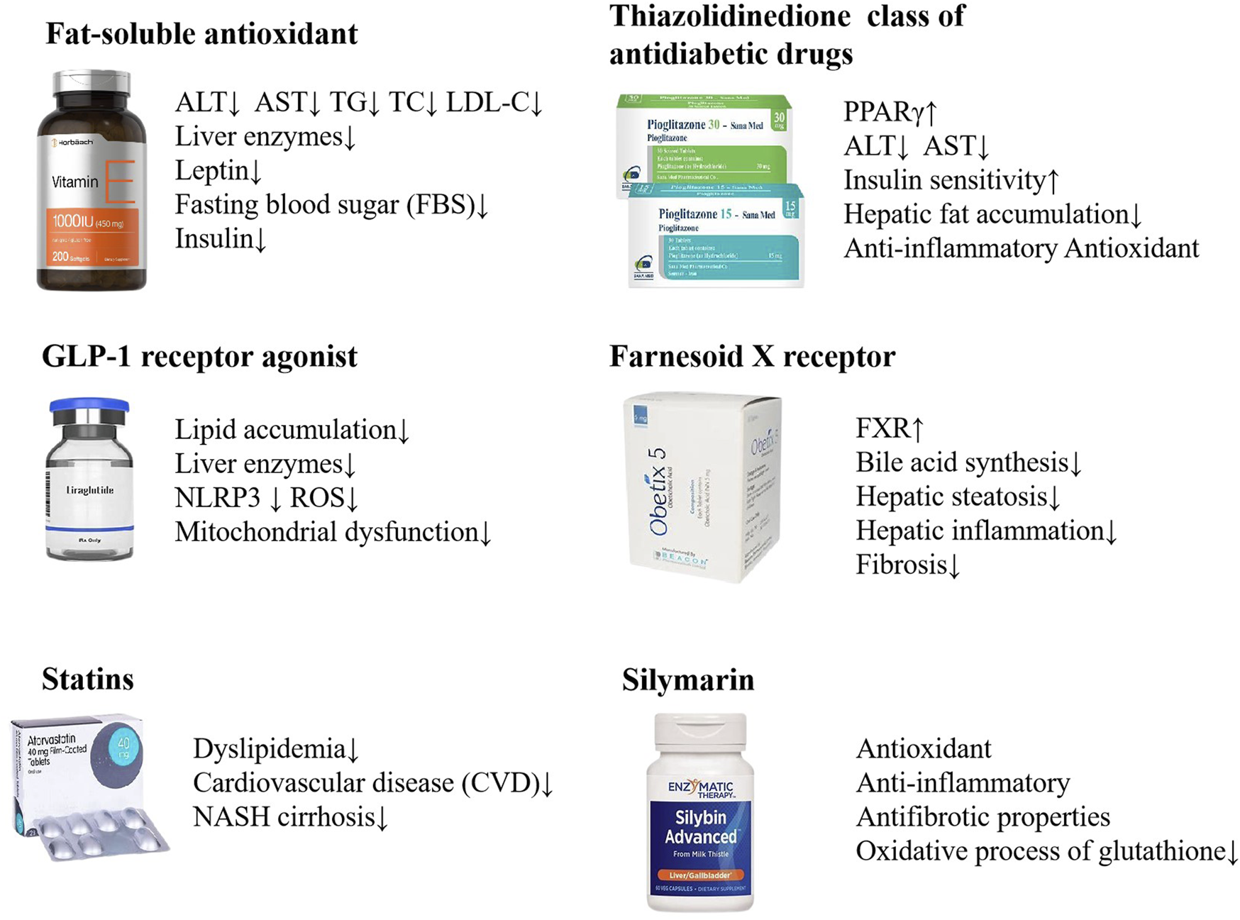 | Dang Fei Li Gan Ning Capsules | Silybum marianum (L.) Gaertn. [Asteraceae;Silymarin], Rumex acetosa L. [Polygonacea;Swertia pseudochinensis] | Clearing damp-heat and benefiting the liver to alleviate jaundice | NAFLD with internal damp-heat retention syndrome | Reducing oxidative stress levels in the liver mediated by nuclear factor E2-related factor 2(Nrf2), promoting liver protein synthesis and bile metabolism, and regulating the expression of transforming growth factor-β1 (TGF-β1) and plasminogen activator inhibitor-1(PAI-1) during disease progression, thereby inhibiting the activation of hepatic stellate cells, collagen proliferation, and promoting the degradation of extracellular matrix, thus preventing liver fibrosis and exerting a hepatoprotective effect | Xiaoling et al. (2022) |