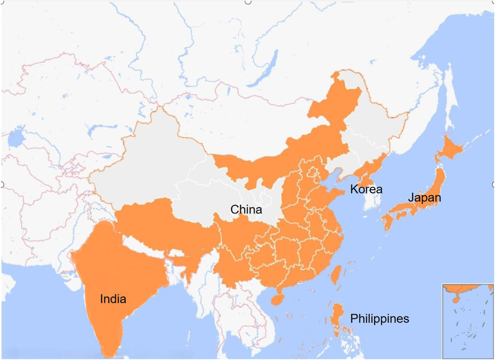 The orange spots in the map depicted the main region of Clerodendrum trichotomum Thunb.