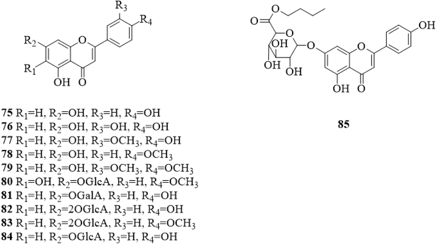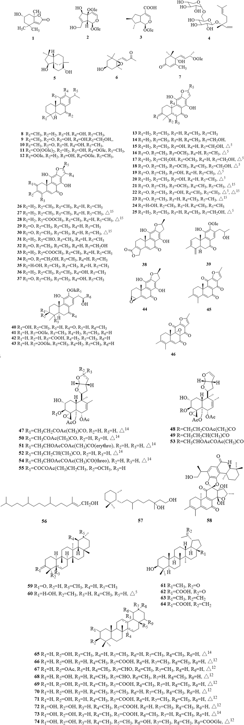 The roots, stems, leaves, flowers and fruits of C. trichotomum can be used as medicinal parts. 164 phytochemicals have been reported in the roots and aerial parts of C. trichotomum (Table 2). Most of these studies were focused on leaves, stems, roots and fruits, while few papers have been done on the flowers so far. The prime objective behind the phytochemical identification in C. trichotomum was the discovery of phytochemicals responsible for the reported biological activities. Hence, in several studies, further biological properties were also analyzed after the phytochemical studies. Various important phytochemicals discovered in these studies may explain the reported biological properties of C. trichotomum. Among 164 secondary metabolites, there were 74 terpenoids (including 4 monoterpenes, 3 sesquiterpenes, 51 diterpenes and 16 triterpenes), 11 flavonoids, 16 steroids, 24 phenylpropanoids, 3 phenylethanosides, 2 phenolic glycosides, 3 anthraquinones, 2 polyketones, 7 cyclohexylethanoids, 7 alkaloids, 2 acid amides, and 13 other compounds (including 3 acids, 3 alcohols, 3 aldehydes, 2 esters, 1 alkane and 1 peroxide). In addition, the volatile oils from different parts of C. trichotomum also have been analyzed and reported.