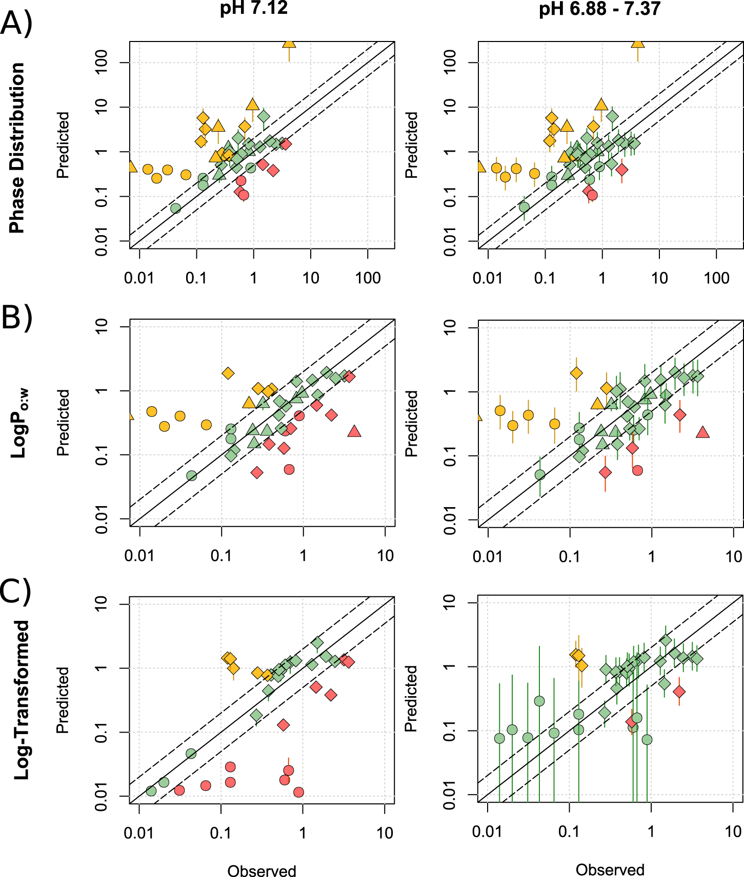 Assessment of published lactation models. Mean (range) predicted M/P ratios versus the observed data for the Phase distribution (A), LogPo:w(B) and Log-Transformed (C) models, for drugs which are not substrates of transporters expressed within the breast. Predictions were made at pH 7.12 and across the range of 6.88–7.37. Solid and dashed black lines represent a P/O ratio of 1 and within 2-fold respectively. Data points are coloured to highlight over-predictions (yellow), underpredictions (red) and predictions within 2-fold (green), whilst shapes represent acids (○), bases (◇) and neutral drugs (□). Data are considered within 2-fold if any value in the predicted range is within 2-fold of the observed data.