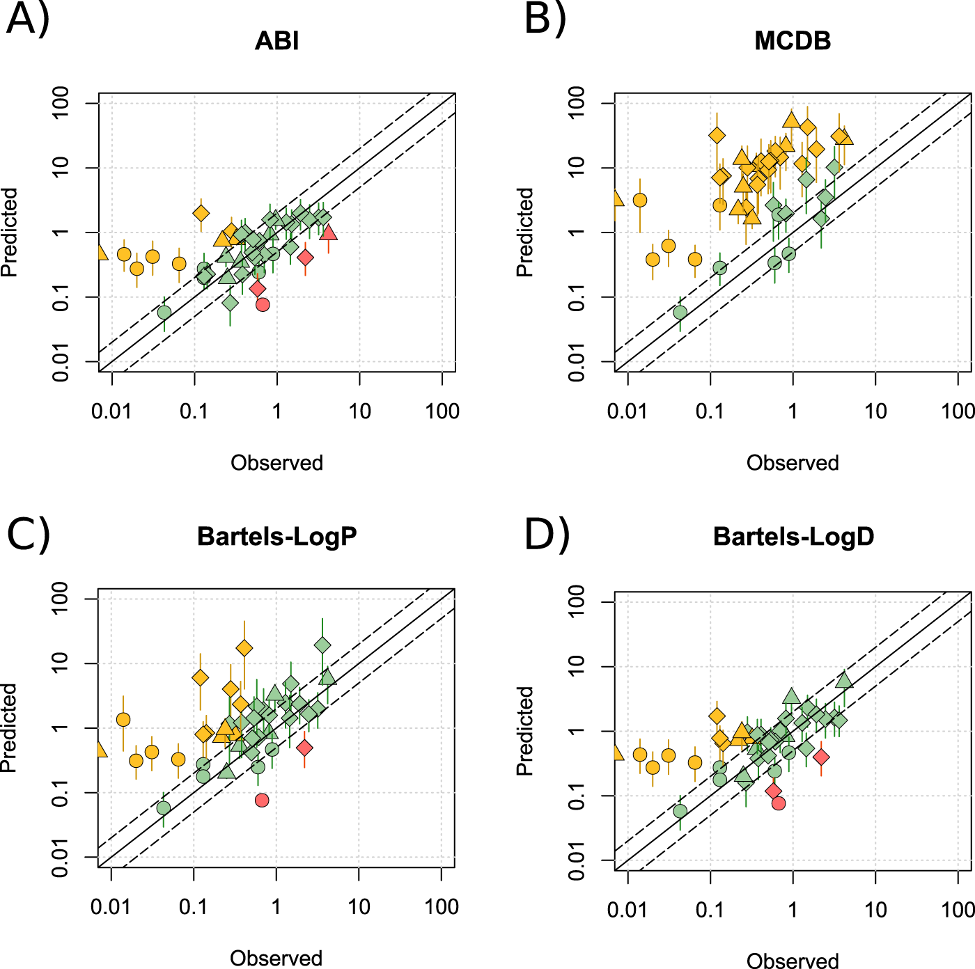 Alternative methods for predicting Pappmilk. Mean (range) predicted M/P ratios versus the observed data for the ABI (A), MCDB (B), Bartels-LogP (C) and Bartels-LogD (D) models, for drugs which are not substrates of transporters expressed within the breast, at a pH of 6.88–7.37 and a Crt of 3%–12%. Solid and dashed black lines represent a P/O ratio of 1 and within 2-fold respectively. Data points are coloured to highlight overpredictions (yellow), underpredictions (red) and predictions within 2-fold (green), whilst shapes represent acids (○), bases (◇) and neutral drugs (□). Data are considered within 2-fold if any value in the predicted range is within 2-fold of the observed data.
