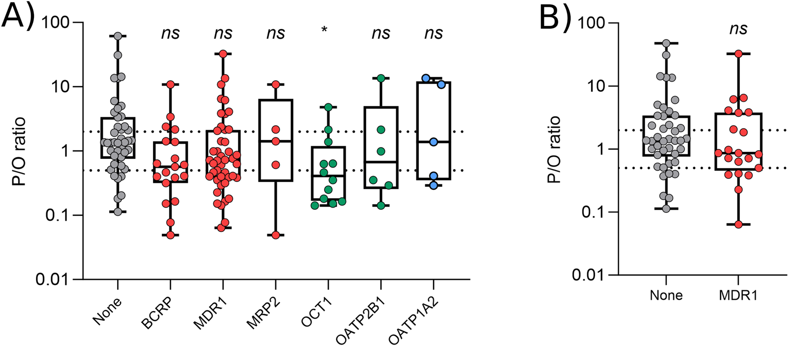 These data are complicated somewhat by the fact that transport of most drugs is mediated by multiple transporters (see Supplementary Table S3 for breakdown). When limiting the transport-mediated drug lists to those which are only mediated by a single transporter, only a significant number of MDR1 substrates were available. The P/O ratio of drugs mediated only by MDR1 was also not significantly different from those drugs not mediated by any transporter (Figure 4B).