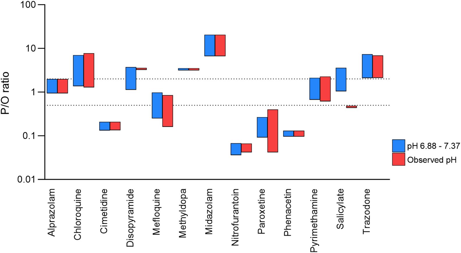 Effect of observed versus mean milk pH values on prediction reliability. Range of P/O ratios calculated using the Bartels-LogD model and either the mean ± SD (blue) or observed (red) milk pH values. The dashed lines represent 0.5 and 2 (2-fold error).