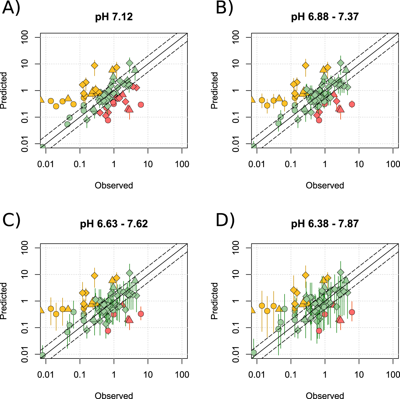 Effect of widening the range of milk pH. Mean (range) predicted M/P ratios versus the observed data for the Bartels-LogD model at a pH of 7.12 (A), 6.88–7.37 (B), 6.63–7.62 (C) or 6.38–7.87 (D). BCRP, MDR1 and OATP2B1 substrates were analysed in addition to drugs which are not mediated by transporters expressed within the breast. Solid and dashed black lines represent a P/O ratio of 1 or within 2-fold respectively. Data points are coloured according to highlight overpredictions (yellow), underpredictions (red) and predictions within 2-fold (green), whilst shapes represent acids (○), bases (◇) and neutral drugs (□). Data are considered within 2-fold if any value in the predicted range is within 2-fold of the observed data.