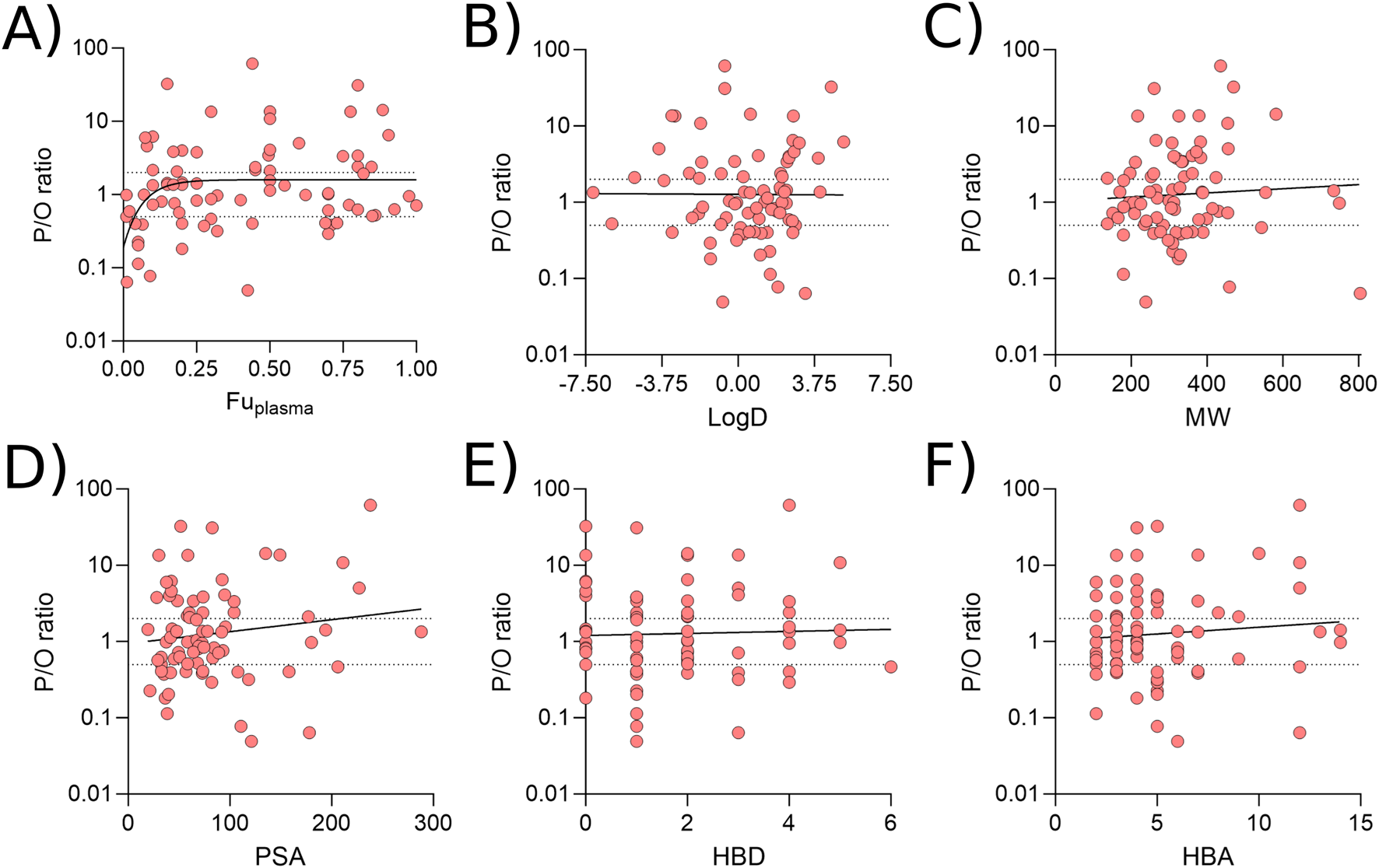 Associations between prediction reliability and physicochemical properties. Correlations between the P/O ratio and Fuplasma(A), LogD (B), molecular weight (C), polar surface are (D), number of hydrogen bond donors (E) and number of hydrogen bond acceptors (F). All data were generated using the Bartels-LogD model and drugs which are substrate of transporters expressed in the breast, or are BCRP1, MDR1 or OATP2B1 substrates. All plots were best fit by linear equations other than A.
