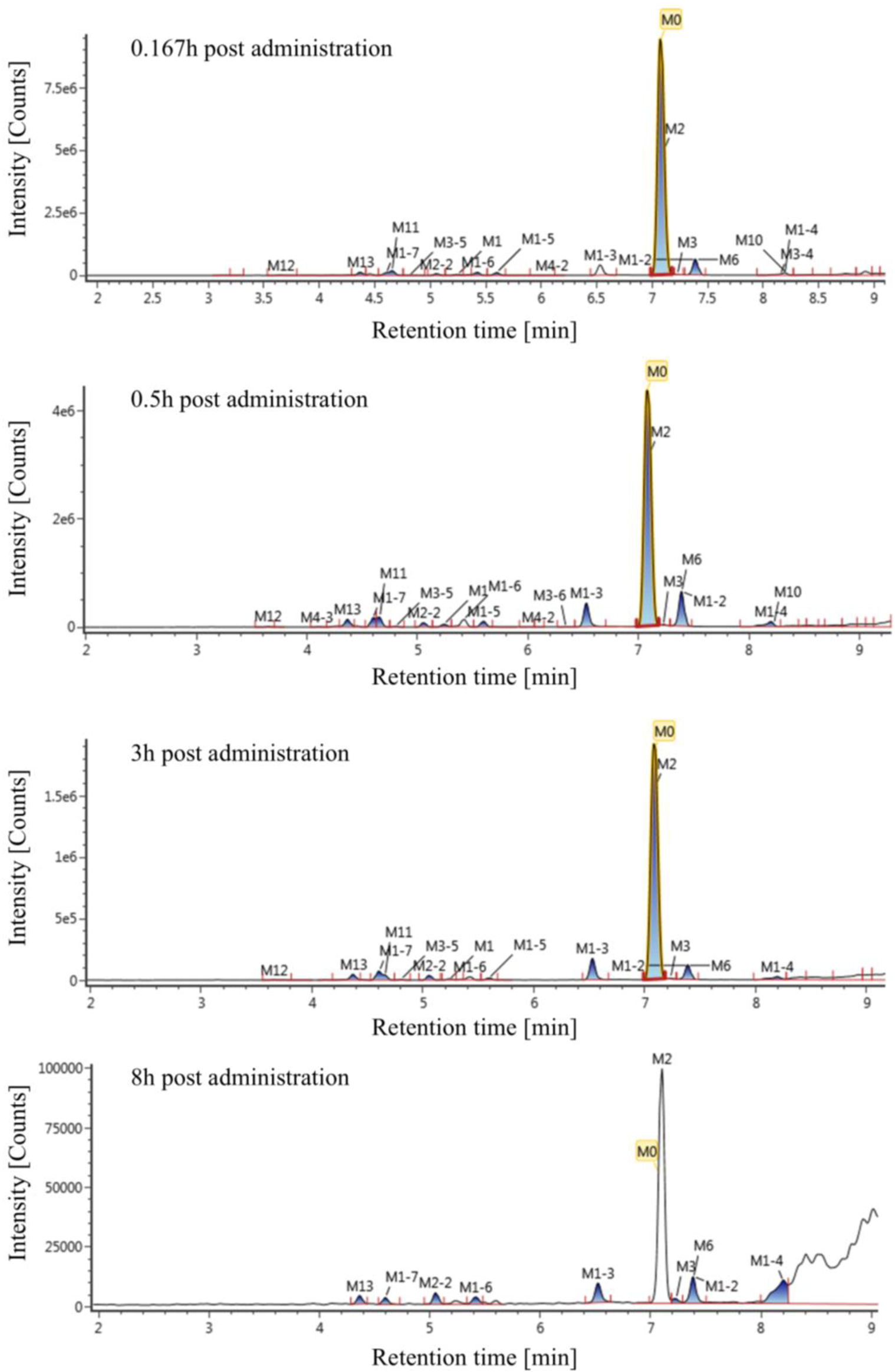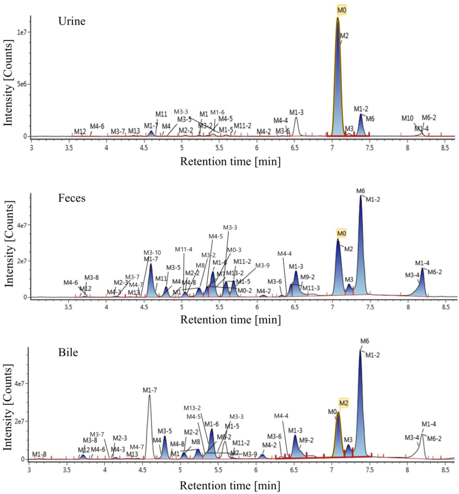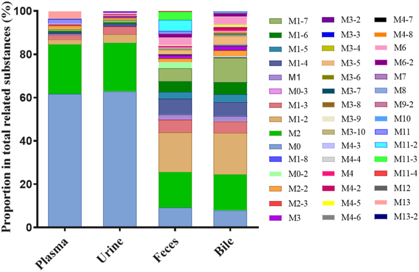 The extraction ion chromatogram of plasma samples at 0.167 h, 0.5 h, 3 h and 8 h after administration of Deg-AZM in rats was shown in Figure 2. The extraction ion chromatogram of urine, feces and bile samples collected from 0 to 24 h after oral administration of Deg-AZM in rats was shown in Figure 3. The AUC0-t of Deg-AZM and its metabolites in plasma sample were calculated by trapezoidal rule based on the chromatographic peak area. The relative proportions of Deg-AZM and its metabolites in rat plasma were evaluated by AUC0-t, as shown in Figure 4. 21 metabolites were found in rat plasma, with M0 (Deg-AZM) and metabolite M2 (demethylated) being the main exposure forms in rat plasma. M0 and M2 accounted for 61.6% and 23.0% of the total related substances in rat plasma, respectively. The relative proportions of Deg-AZM and its metabolites in urine, feces and bile samples were evaluated by the chromatographic peak area, as shown in Figure 4. The detailed proportion of Deg-AZM and its metabolites could be found in Supplementary Table S1. M0 and 28 metabolites were found in the urine of rats. M0 (62.9%) and metabolite M2 (22.5%) were the main forms of urinary excretion of Deg-AZM in rats after oral administration. M0 and 42 metabolites were found in the feces of rats. Metabolite M1-2 (monohydroxylation, 18.1%) and metabolite M2 (16.6%) were the main forms of fecal excretion of Deg-AZM in rats after oral administration. M0 and 38 metabolites were found in the bile samples of rats. Metabolite M1-2 (monohydroxylation, 19.2%) and metabolite M2 (16.5%) were the main forms of biliary excretion of Deg-AZM in rats after oral administration.