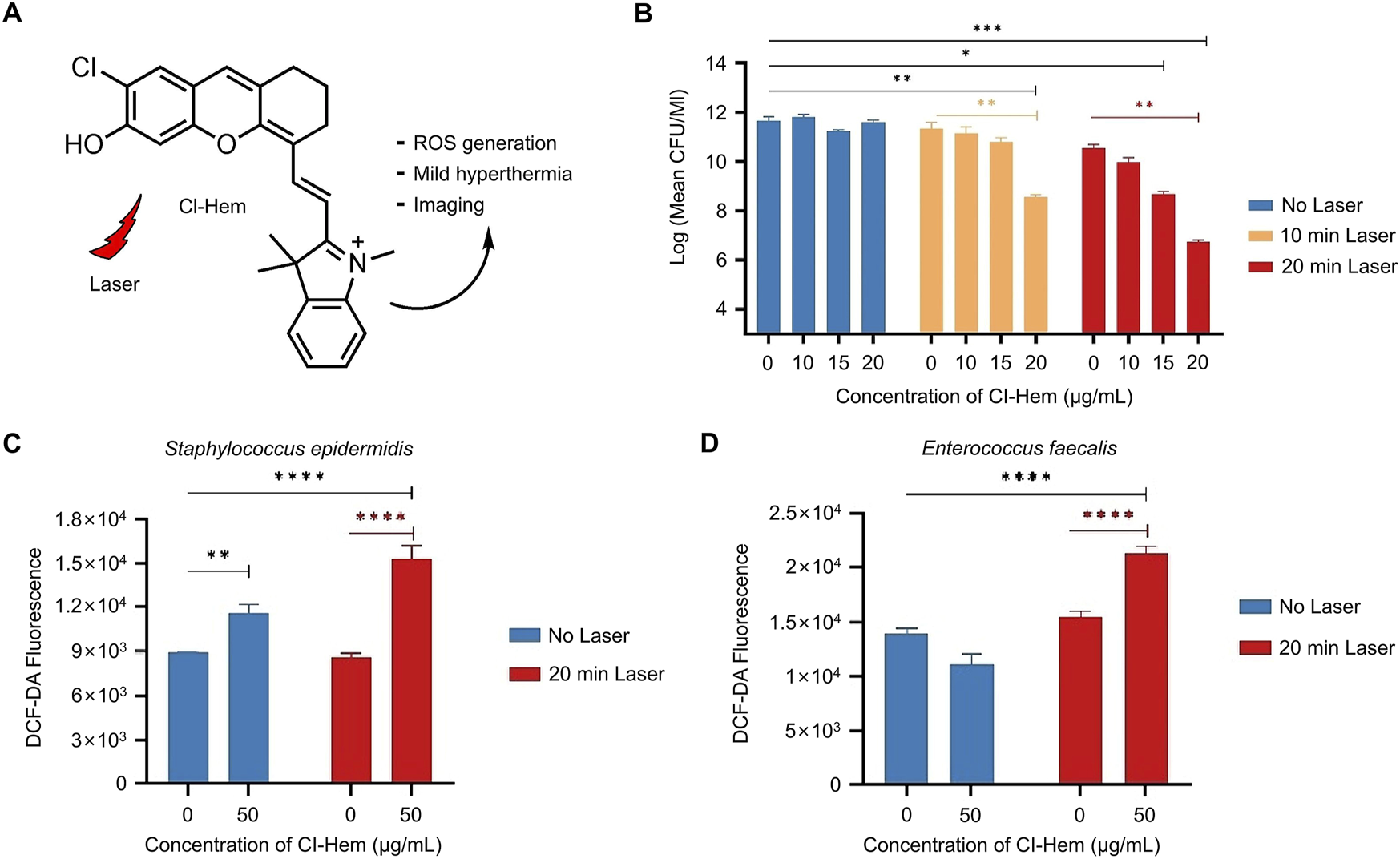 Figure 2. Antibacterial mechanism and effect of Cl-Hem (Atac et al., 2024) (A) Molecular structure of Cl-Hem (B) Dose-dependent antibacterial effect of Cl-Hem on plankcells of Staphylococcus epidermidis with/without laser irradiation (C) Fluorescence intensity of DGF-DA in Gram-positive cells treated with Cl-Hem (0 or 50 μg/mL) (D) Fluorescence intensity of DCF-DA in Cl-HEM-treated Gram-negative bacteria. Data are presented as the mean ± SD (n = 3 in each group). Statistical data are represented as mean ± SD (n = 3; *P < 0.05, **P < 0.01, ***P < 0.001, and ****P < 0.0001; NS represents no significant difference). Copyright © 2024 Elsevier B.V.