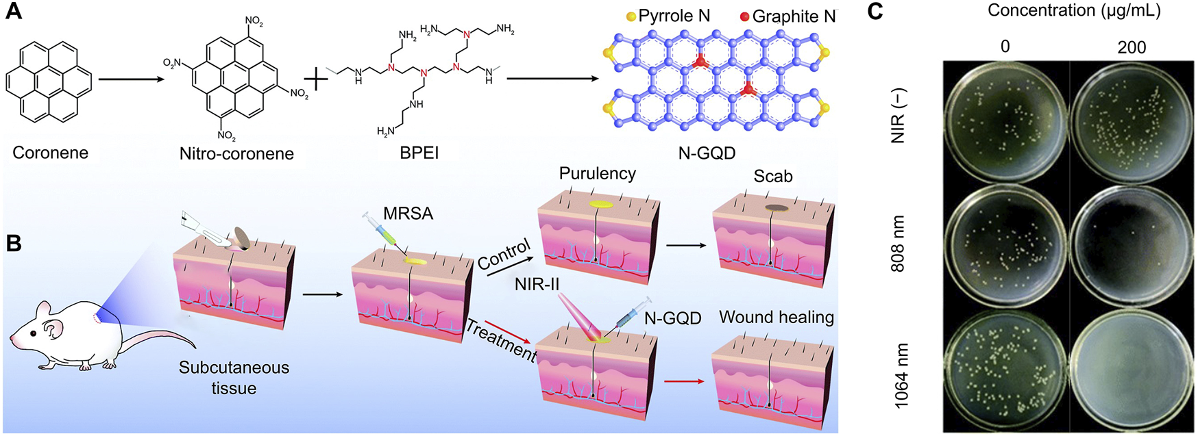 Geng et al. synthesized high graphidic acid N-doped graphene quantum dots (N-GQD) with efficient NIR-II photothermal conversion properties for photothermal antibacterial therapy (Figures 4A, B) (Geng et al., 2022). The obtained N-GQDs showed strong NIR absorption in the range of 700–1,200 nm and achieved high photothermal conversion efficiencies of 77.8% and 50.4% at 808 and 1,064 nm, respectively. In the presence of 808 or 1,064 nm laser, N-GQD achieved excellent antibacterial and anti-biofilm activity against MDR bacteria (methicillin-resistant MRSA, MRSA) (Figure 4C). In vivo studies confirmed that hyperthermia generated by N-GQD plus NIR-II laser antagonized MDR bacterial infection and thereby significantly accelerated wound healing.