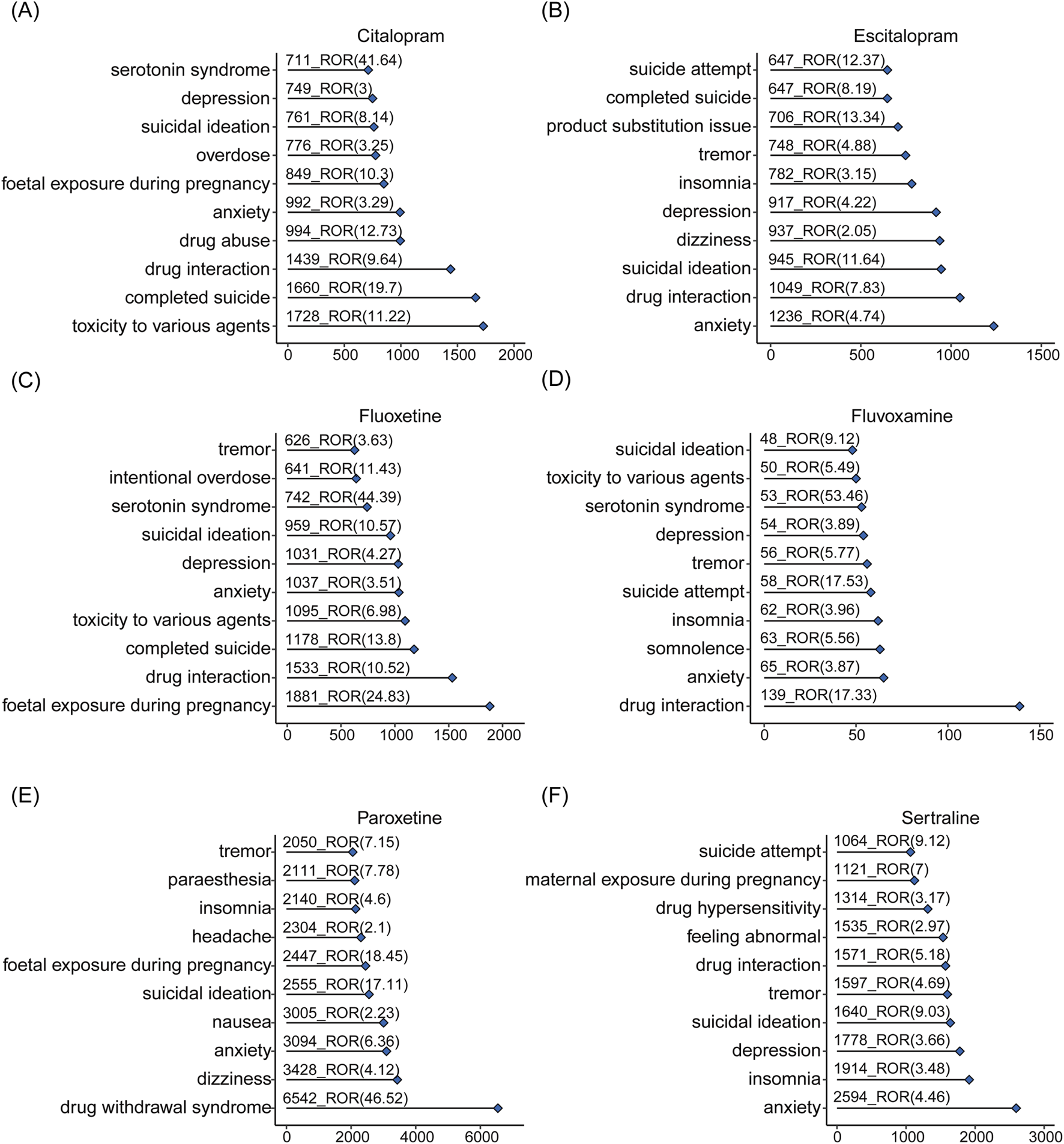 The overall signals of disorders associated with SSRIs. Adverse reactions related to citalopram (A), escitalopram (B), fluoxetine (C), fluvoxamine (D), paroxetine (E), sertraline (F) and occurring in the top 10 numbers.