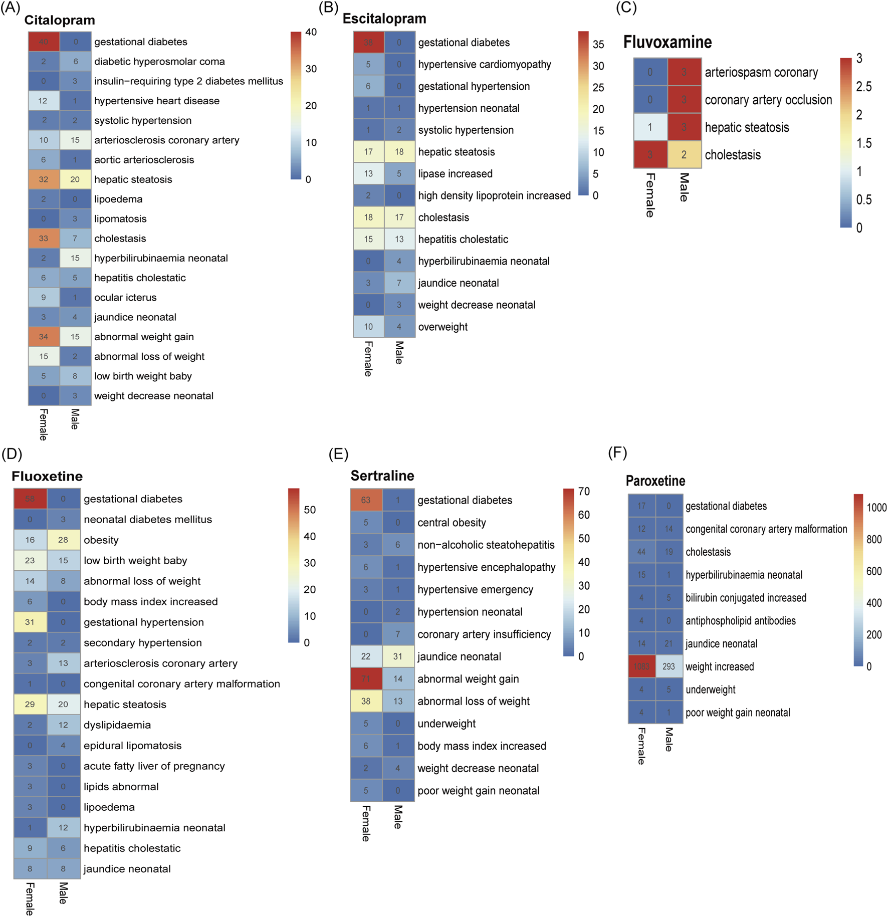 Differences in adverse reactions triggered by abnormalities in glucolipid metabolism in men and women after taking SSRIs. (A) Citalopram. (B) Escitalopram. (C) Fluvoxamine. (D) Fluoxetine. (E) Paroxetine. (F) Sertraline. The numerical values in the heatmap represent the number of specific PTs occurrences in males and females, respectively.