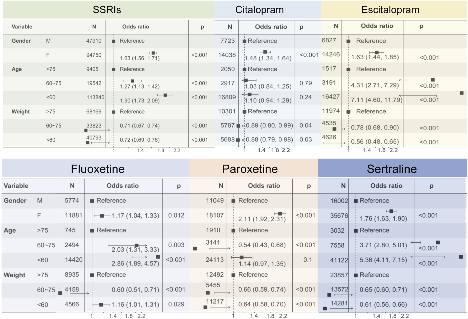 | Characteristics | Citalopram (N = 21,820) | Escitalopram (N = 19,288) | Fluoxetine (N = 21,455) | Fluvoxamine (N = 1224) | Paroxetine (N = 36,982) | Sertraline (N = 42,975) | |