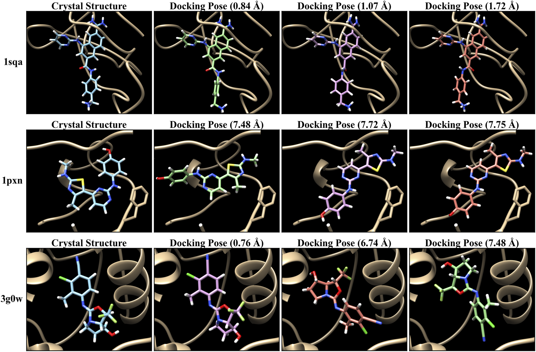 Figure 2. Examples of crystal structures and their docking poses of PDBbind CASF-2016 (core set). Autodock VINA (Trott and Olson, 2010; Eberhardt et al., 2021) with ConveyorLC (Zhang et al., 2014) was used for molecular docking.