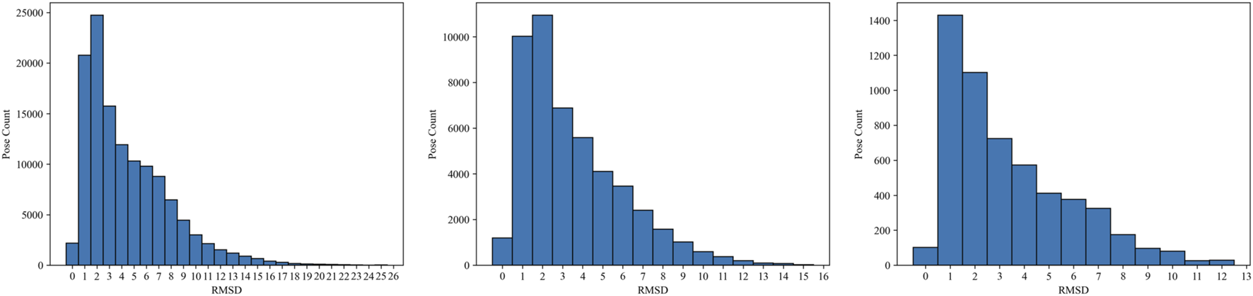 Figure 3. Statistics of the docking poses for training and evaluation. The plots represent the RMSD histograms between the docking poses and original crystal ligands in PDBbind 2020 general (left), refined (middle), and CASF-2016 (right) sets. Each histogram bin represents the number of poses within the specific RMSD range.