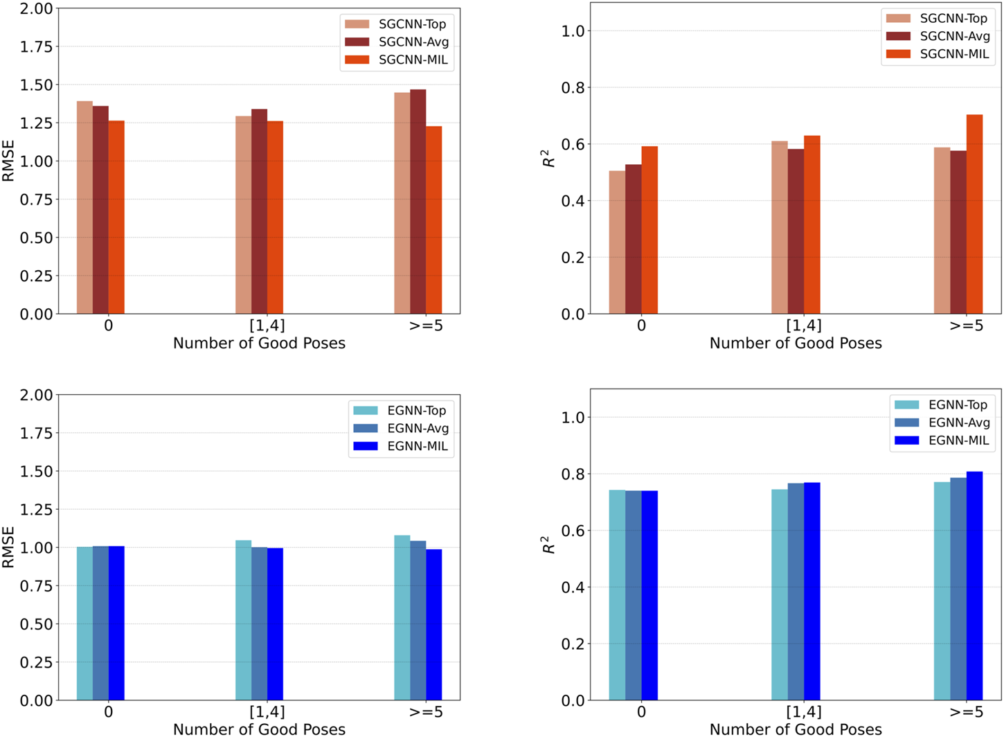 Figure 4. Model performance of binding affinity prediction on the PDBbind CASF-2016 dataset, based on the number of good docking poses within each complex entity. The evaluation data were divided into three groups: structures with no good poses, those with 1–4 good poses, and those with more than 4 good poses. The top and bottom row show results using the SGCNN and EGNN backbones, respectively. The left and right columns show RMSE and