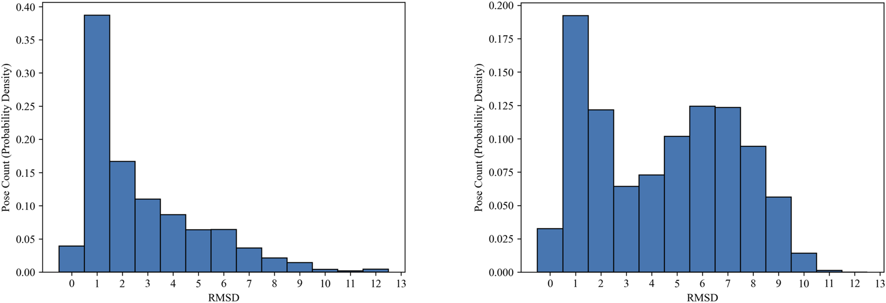 Figure 5. Histograms (probability density) of pair-wise RMSD errors between ligand docking poses in the PDBbind CASF-2016 (left) and SARS-CoV-2 Main Protease (right) datasets.