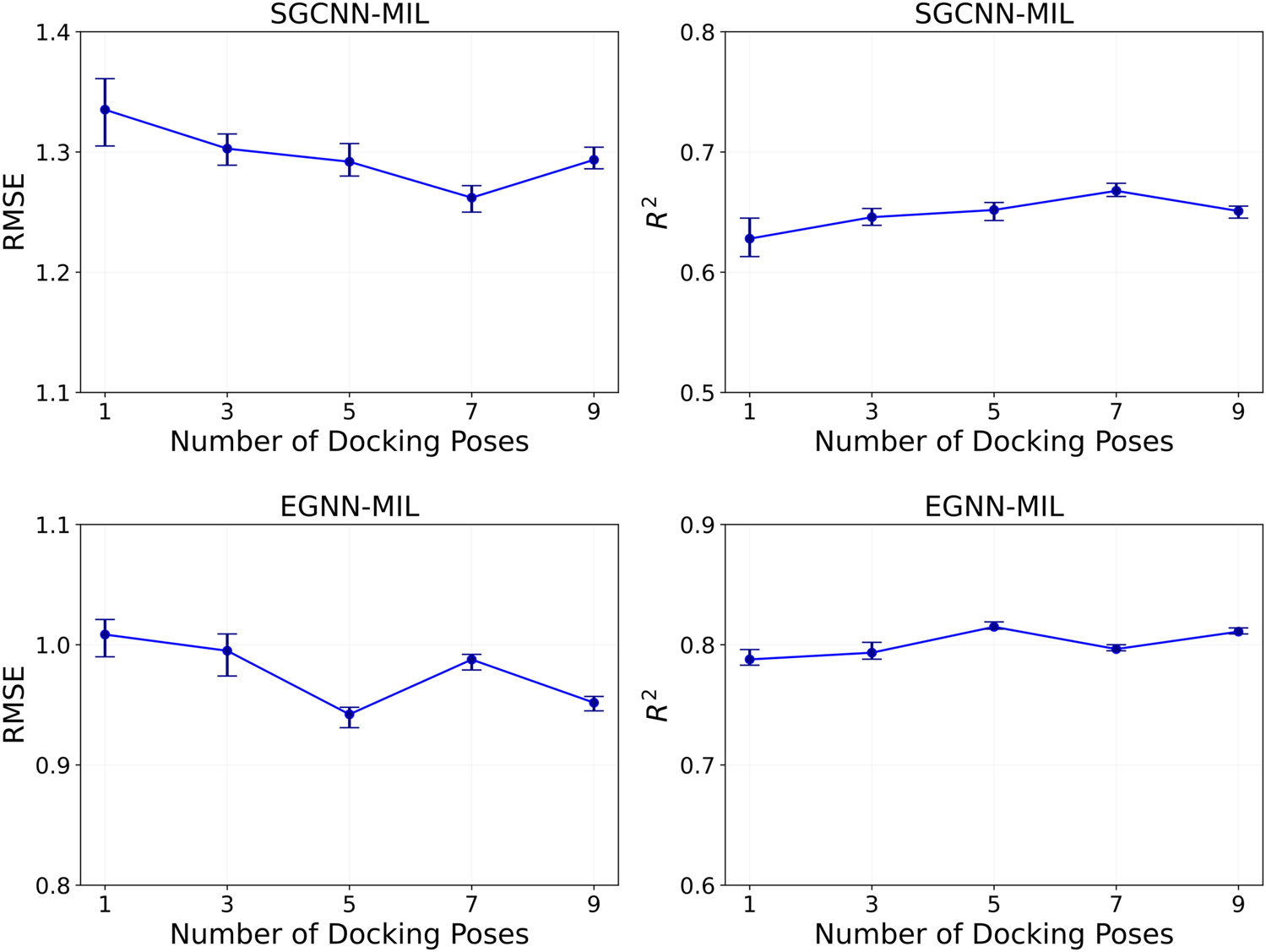 Figure 6. Model performance of binding affinity prediction on the PDBbind CASF-2016 dataset, based on the number of docking pose instances within each complex entity. The evaluation was performed where the number of poses is 1, 3, 5, 7, and 9. The top and bottom row show results using the SGCNN and EGNN backbones, respectively. The left and right columns show RMSE and