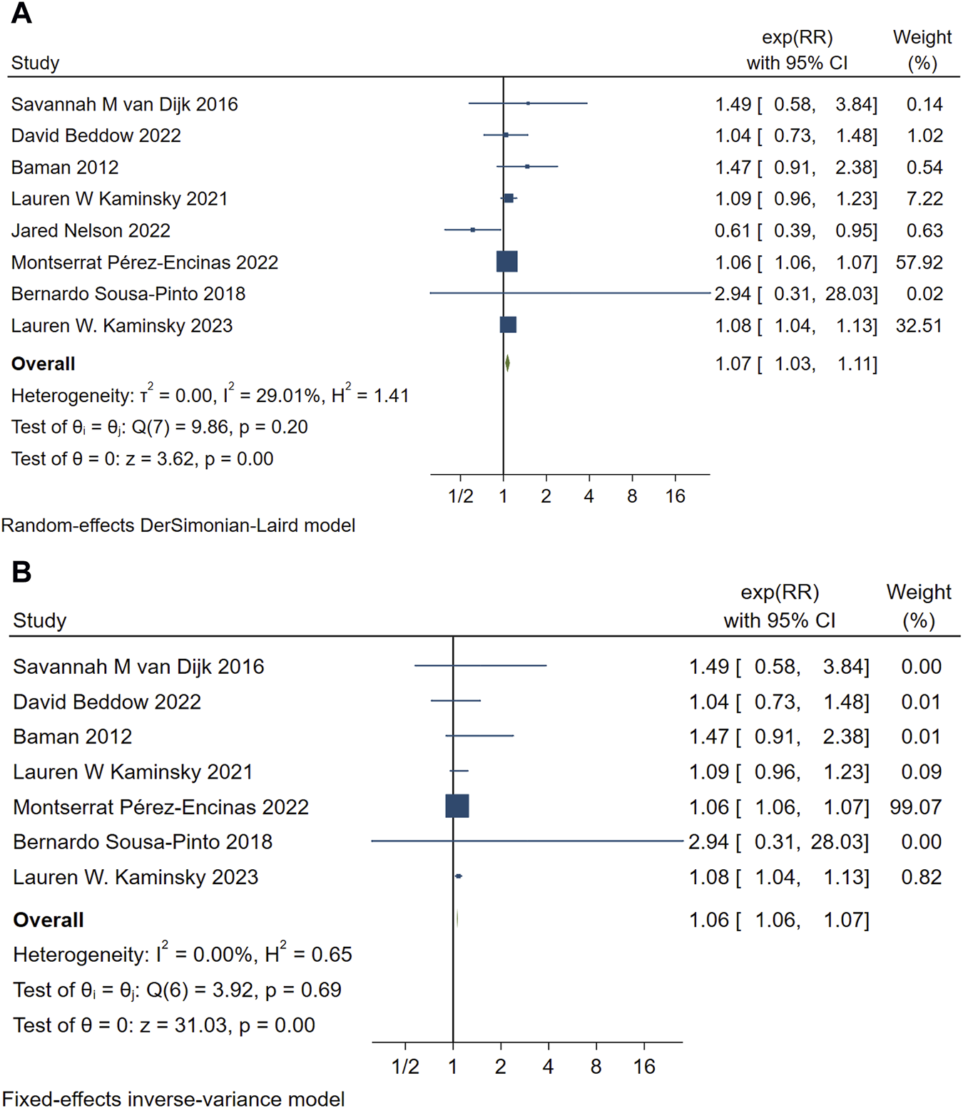 Eight studies analyzed the relationship between PAL and mortality (van Dijk et al., 2016; Beddow et al., 2022; Baman et al., 2012; Kaminsky et al., 2023; Motoa et al., 2019; Nelson et al., 2022; Sousa-Pinto et al., 2018; Kaminsky et al., 2021). The pooled analysis demonstrated an association between penicillin allergy labeling and mortality (RR = 1.07, 95% CI 1.03–1.11, τ2 = 0.00, I2 = 29.01%) as shown in Figure 2A. The sensitivity analysis indicated that the results were not robust, The sensitivity analysis indicated that the results were not robust, the Jared Nelson 2022 study was a possible source of the unreliable results. After excluding studies involving cooperative severe surgeries [e.g., kidney transplantation (Nelson et al., 2022)] as shown in Figure 2B, the pooled estimate was RR = 1.06 (95% CI 1.06–1.07, I2 = 0.00%), with significantly reduced heterogeneity. Sensitivity analysis revealed no conflicting outcomes after the exclusion of any study, indicating robust results. The combined evidence suggests that penicillin allergy labeling is associated with increased mortality, with the difference being statistically significant.