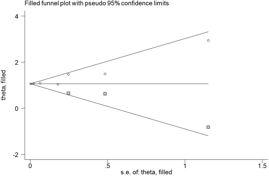 The combination of funnel diagram (Figure 4) and egger test analysis results (p = 0.019 < 0.05) suggested that there was publication bias in the included literature, and the clip-supplement method was used for verification (Figure 5). The results did not change, indicating that the results of the article were robust.