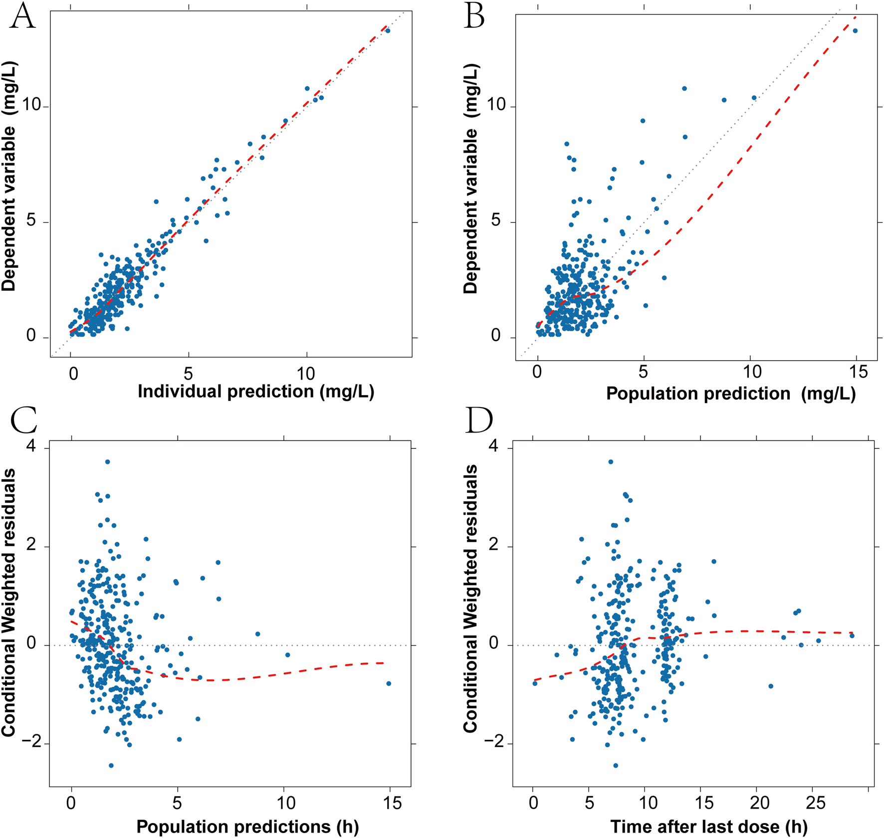 Diagnostic goodness-of-fit plots for the final model. (A) Scatter plot of imipenem plasma concentration and individual predicted values. (B) Scatter plot of imipenem plasma concentration and population predicted values. (C) Scatter plot of conditional weighted residuals and population predicted values. (D) Scatter plot of conditional weighted residuals and time from last dose. The black dashed line is the reference line, and the red dashed line is the LOWESS trend line.