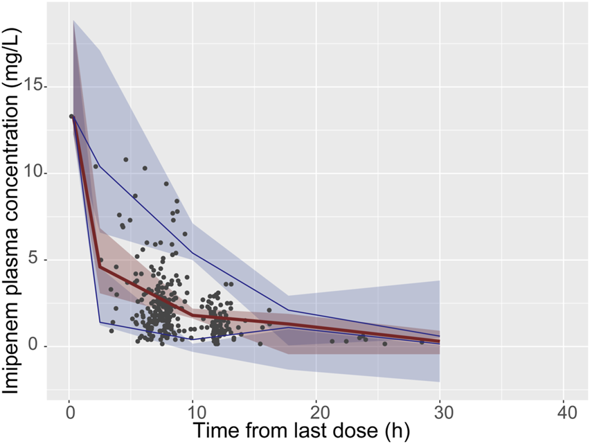 A total of 370 observations available from 142 patients were incorporated in the PPK model. A two-compartment PPK model with linear elimination best predicted the imipenem plasma concentrations, with the creatinine clearance as a significant covariate of clearance. Typical estimates for clearance, inter-compartmental clearance, central and peripheral volume were 13.1 L·h−1, 11.9 L·h−1, 11.7 L, 29.3 L, respectively.