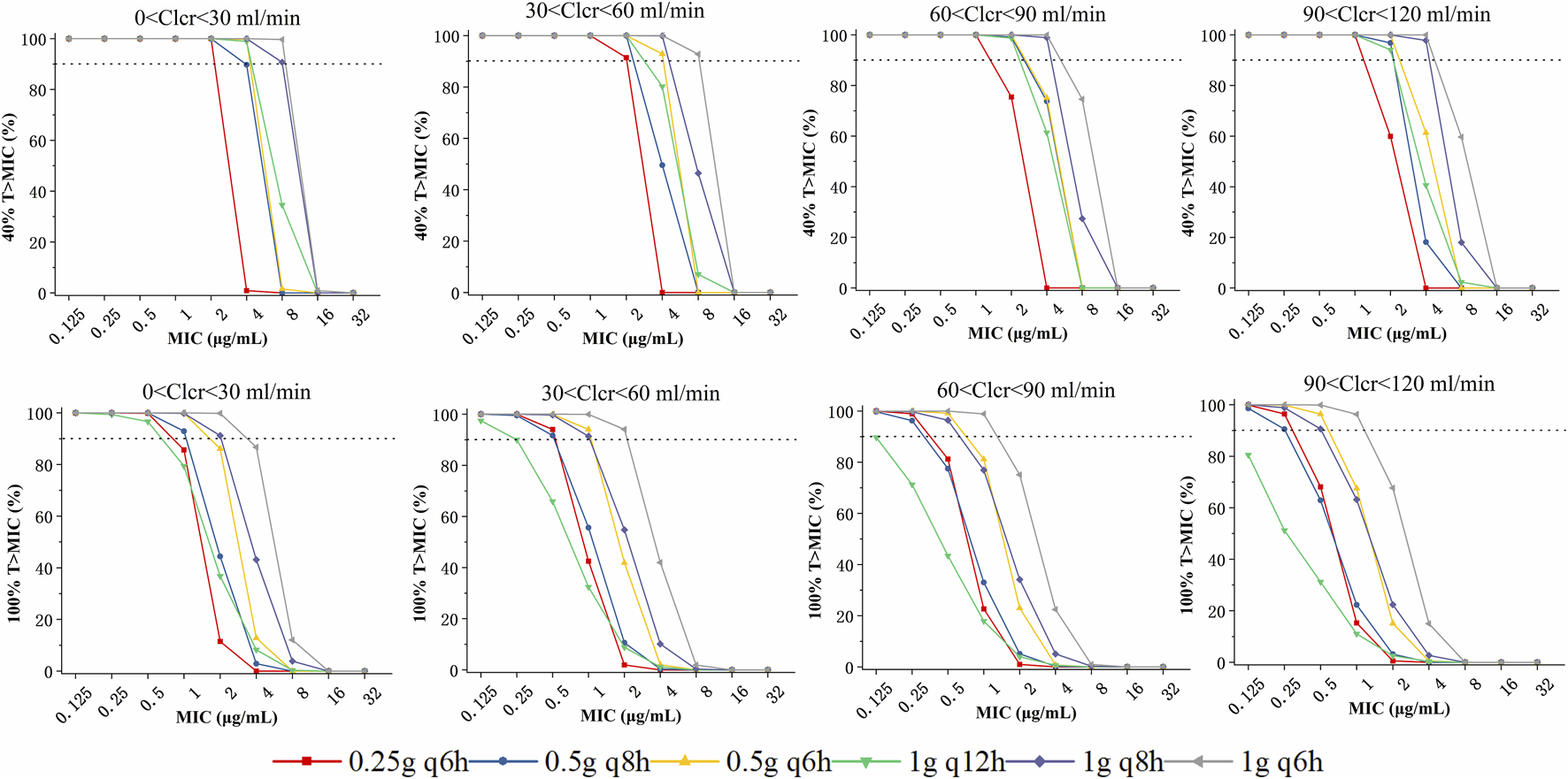 A population pharmacokinetic (PPK) model was constructed utilizing a nonlinear mixed-effects modeling approach. The final model underwent evaluation through bootstrap resampling and visual predictive checks. Additionally, a population pharmacokinetic and pharmacodynamic analysis was conducted employing Monte Carlo simulations to investigate the impact of commonly used dosing regimens (0.25 g every 6 h, 0.5 g every 6 h, 0.5 g every 8 h, 1 g every 6 h, 1 g every 8 h, and 1 g every 12 h) on the likelihood of achieving the target therapeutic outcomes.
