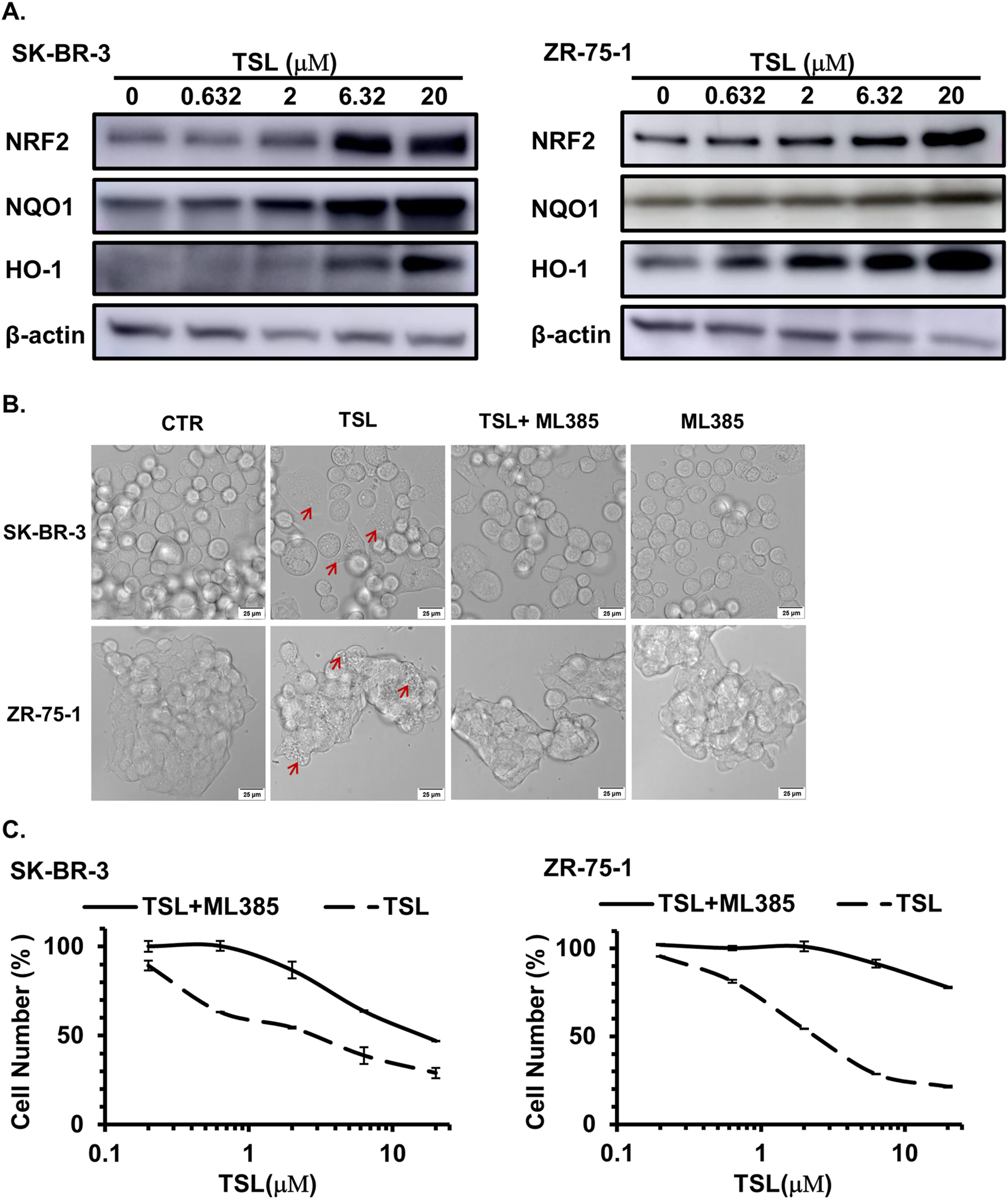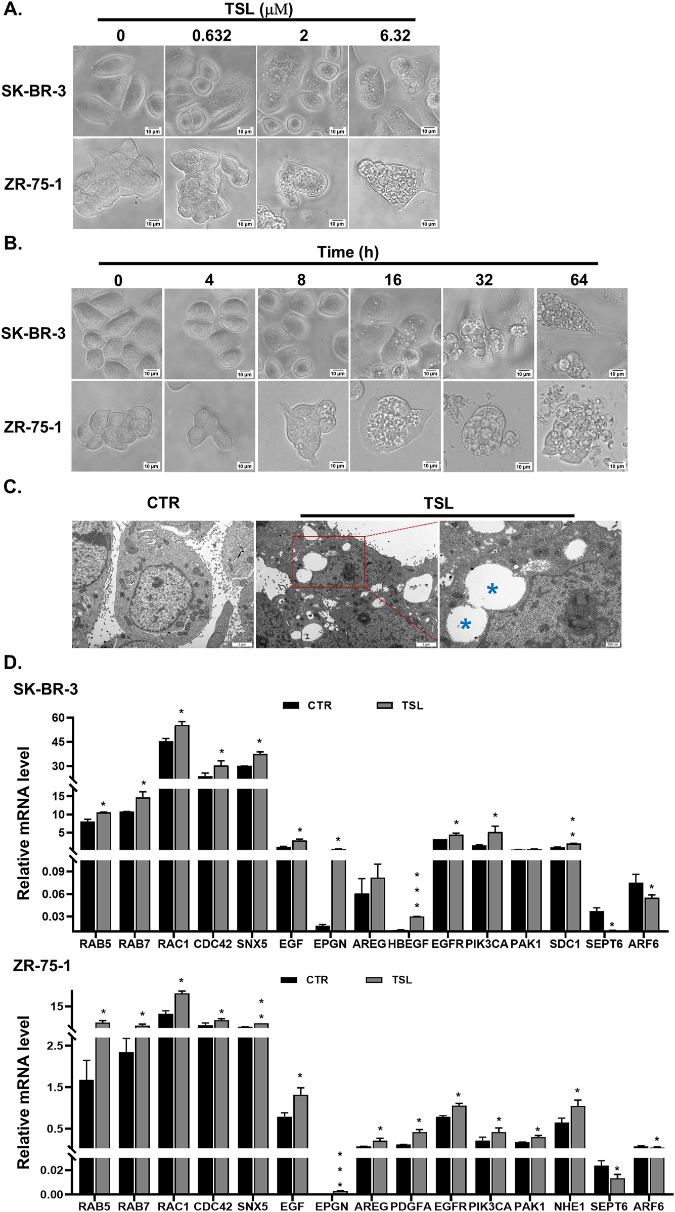 Tanshinlactone (TSL) was initially extracted from the herb Salvia miltiorrhiza (Luo et al., 1986), which was widely used in traditional Chinese medicine (TCM) for cardiovascular and cerebrovascular diseases, pain, and insomnia (Ryu et al., 1997; Wu et al., 1991). While its anti-cancer potential was first observed in HepG2 liver cancer cells by inhibiting tumor angiogenesis (Xiang et al., 2012), the full breadth of its anti-proliferative activities and the underlying mechanisms remain largely unexplored. Our investigation has illuminated a new facet of TSL’s pharmacological profile, revealing its selective anti-proliferative efficacy against breast cancer cells overexpressing estrogen receptor (ER) or human epidermal growth factor receptor 2 (HER2)/epidermal growth factor receptor (EGFR). Remarkably, TSL exhibits minimal toxicity towards normal cells and other types of cancer cells, emphasizing its favorable safety profile. This selective cytotoxicity is linked to the induction of methuosis via NRF2 activation. Furthermore, TSL exhibits efficacy against lapatinib-resistant breast cancer cells, offering a promising avenue for breast cancer therapy.