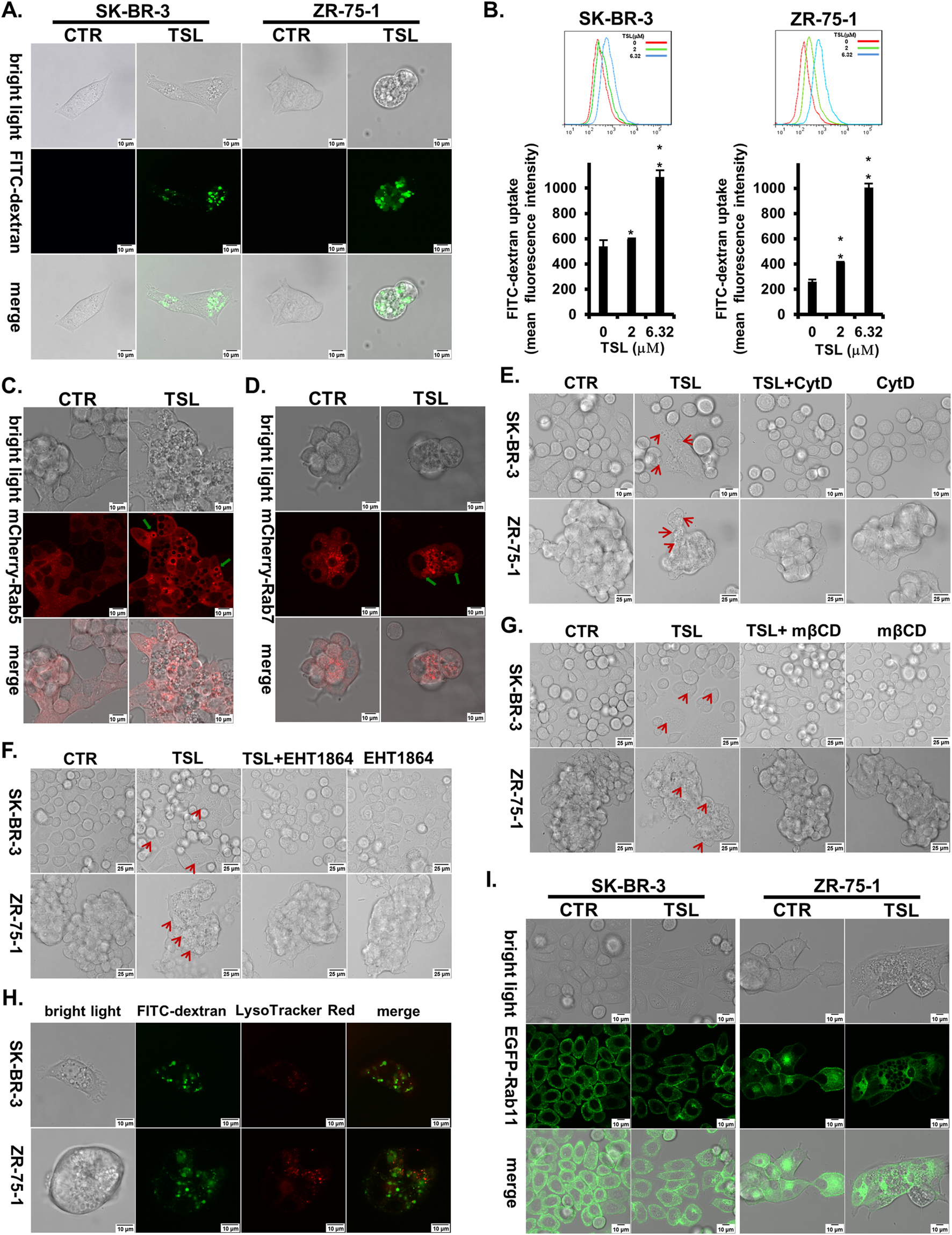 Labeling of macropinosomes with fluid-phase fluorescent tracer FITC-dextran (70 kDa) followed the protocol as described previously (Commisso et al., 2014). Untreated and TSL-treated cells were incubated with 1 mg/mL of FITC-dextran (70 kDa) (Invitrogen) in the appropriate serum-free medium in a 37°C, 5% CO2 incubator for 30 min. Then the dextran cell culture incubation media was carefully aspirated, and the cells were washed two times with ice-cold PBS. Bright light and fluorescent images were captured using confocal microscope. To visualize the lysosomes, the cells were subsequently incubated for 15 min in the fresh medium with 75 nM of LysoTracker Red DND-99 (Invitrogen), washed twice with fresh medium, and then imaged with FITC and TRITC filters.