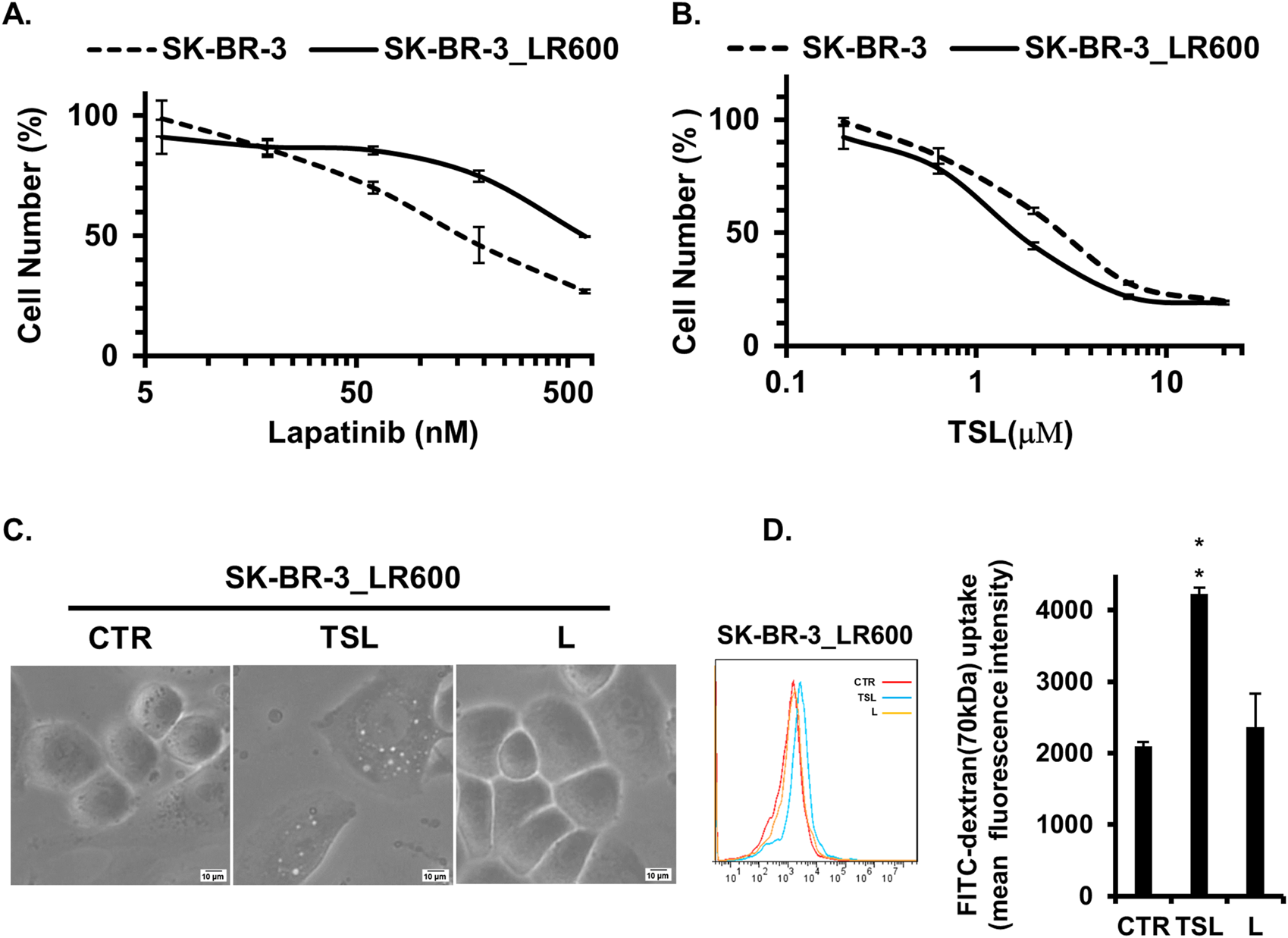 Non-microscopy-based quantitative method for the analysis of macropinocytosis utilizes Flow Activated Cell Sorting (FACS). Briefly, cells were seeded at 2–4 × 105 cells/well in 6-well-plate overnight. Untreated and TSL-treated cells were incubated with 1 mg/mL of FITC-dextran (70 kDa) in the appropriate serum-free medium in a 37°C, 5% CO2 incubator for 30 min. Then cells are washed, trypsinized, and dextran uptake is subsequently quantified via a FACSAria II flow cytometry (BD Bioscience). The data were analyzed using FlowJo software to determine the total number of dextran-positive cells. Mean fluorescence intensity of the population was determined.
