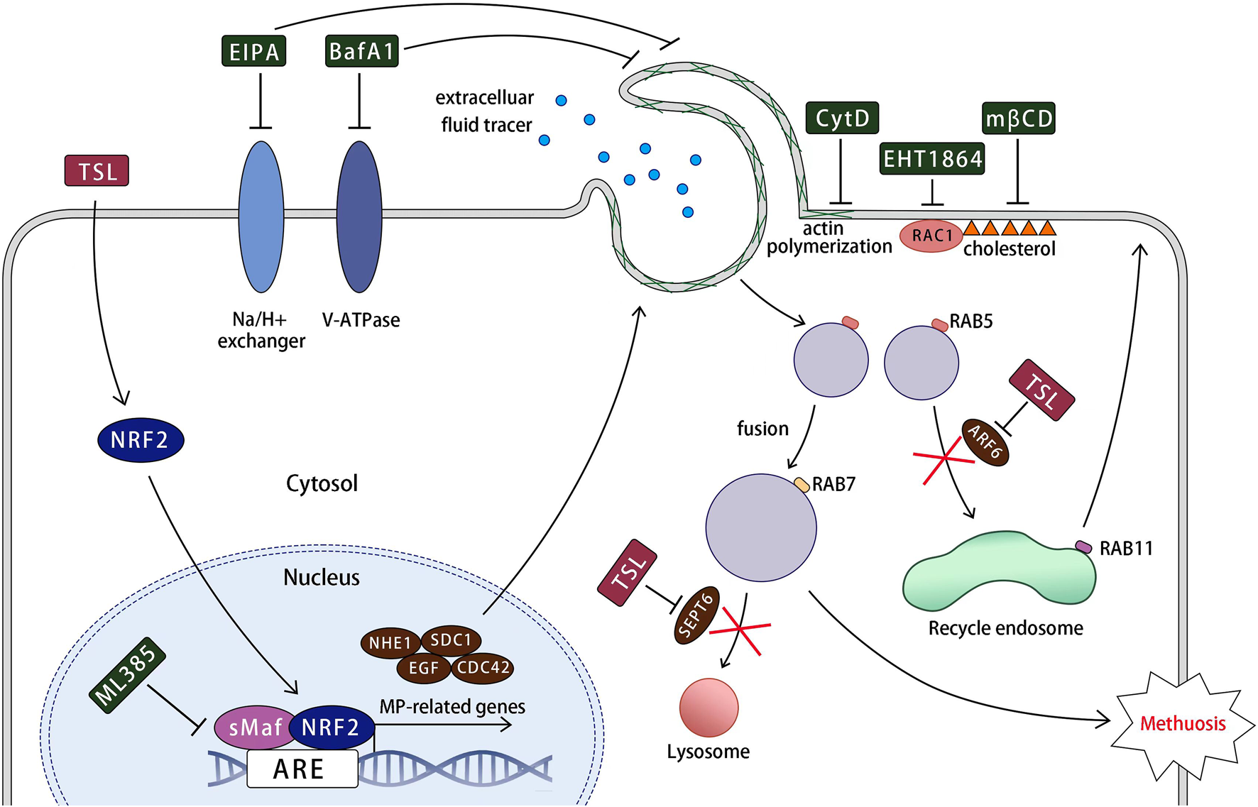 Tanshilactone (TSL, YMbio, Shanghai, China), ethylisopropylamiloride (EIPA, MedChem Express), bafilomycin A1 (BafA1, MedChemExpress), methyl-β-cyclodextrin (mβCD, MedChemExpress), cytochalasin D (CytD, MedChemExpress), EHT1864 (MedChemExpress), ML385 (MedChemExpress), Q-VD-OPh (QVD, MedChemExpress), liproxstatin-1 (Lip-1, MedChemExpress), necrostatin-1 (Nec-1, MedChemExpress) and lapatinib (L, MedChemExpress) were dissolved in dimethyl sulfoxide (DMSO, Sigma Aldrich) and stored at −40°C.
