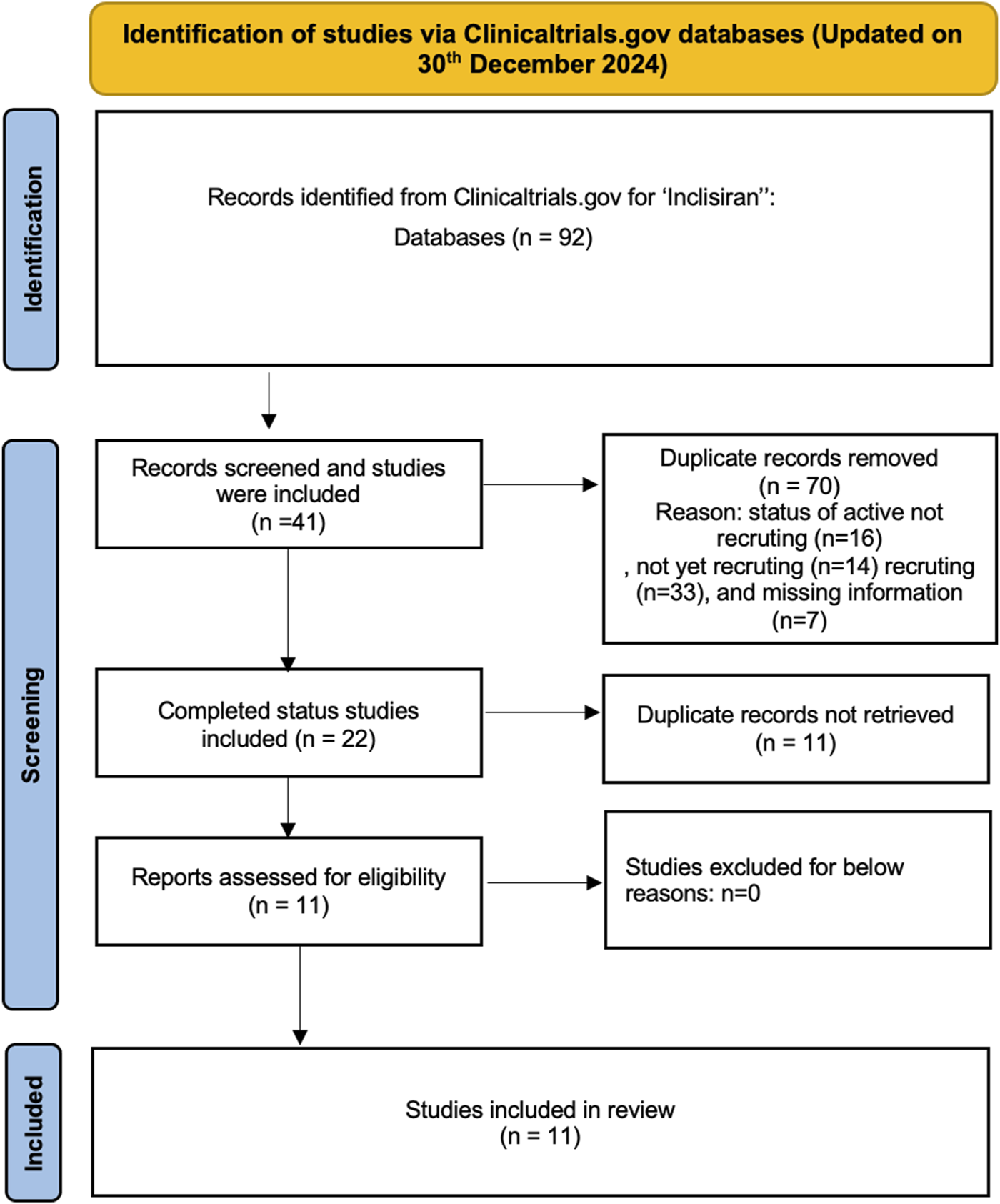 The preliminary search of the ClinicalTrials.gov database for the “condition/disease” keywords and inclisiran the “other terms” field yielded 92 trials. These trials were extraced and manually examined. After screening the 92 trials, 70 studies were discarded that had a study status of active not recruting, not yet recruting and recruting were excluded. The remaining 41 trials were further examined and 22 completed trials were found but 11 duplicates were removed. Finally, this process yielded 11 completed studies that were included in this review. A synopsis of the study selection process is presented in Figure 1.