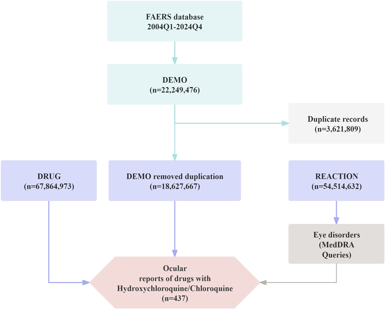 The Adverse Event Reporting System (FAERS), managed by the United States Food and Drug Administration (FDA), represents the largest spontaneous reporting database, encompassing over 27 million submissions related to adverse events, medication errors, and product quality issues reported to the FDA. This database provides a comprehensive overview of adverse events observed in real-world clinical settings (Hu et al., 2022). The present study aims to evaluate ocular adverse reactions associated with the use of chloroquine and hydroxychloroquine in the treatment of systemic lupus erythematosus, thereby offering clinicians a more robust basis for risk assessment and monitoring recommendations for these medications (Hu et al., 2022).