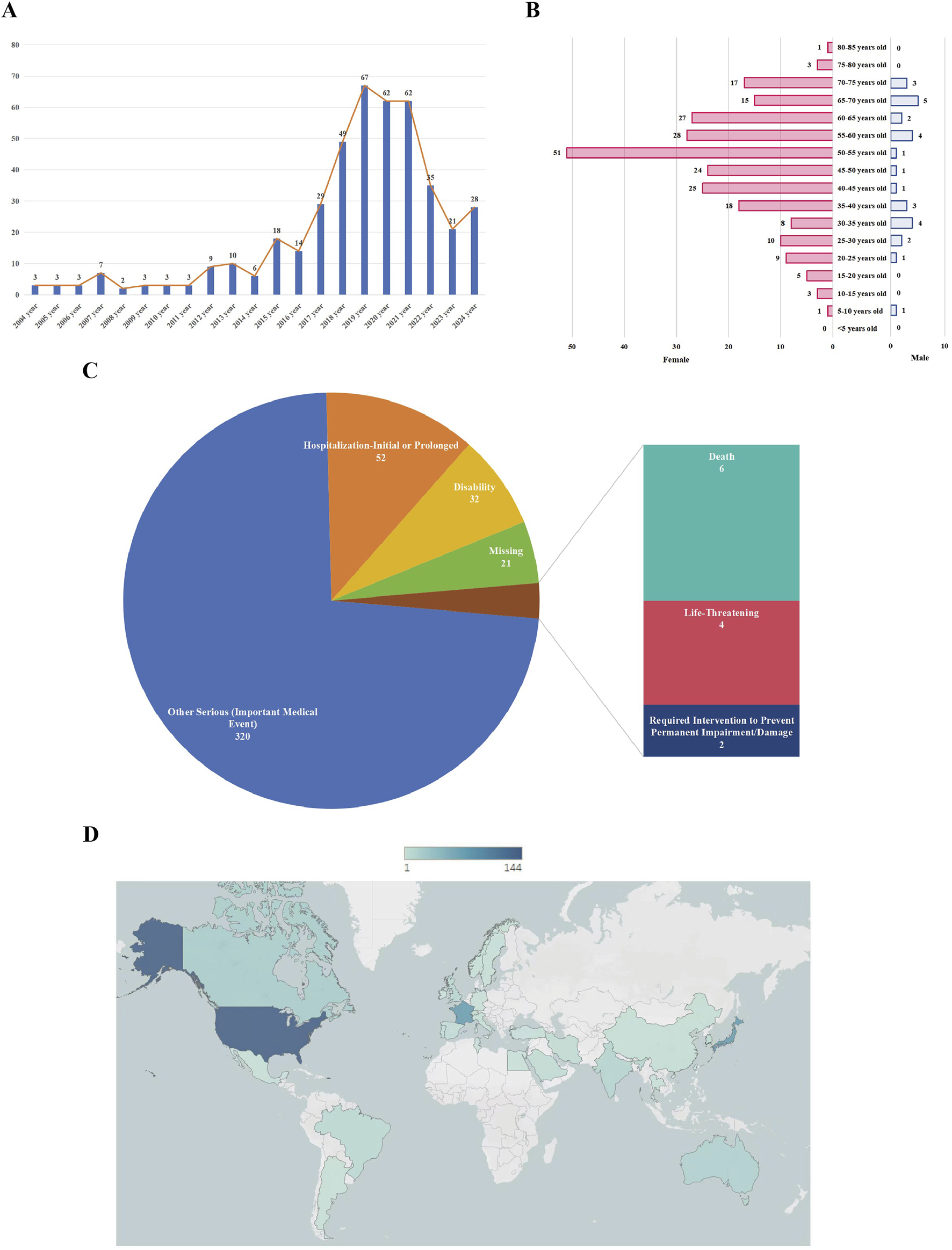 Figure 2. The characteristics of chloroquine- and hydroxychloroquine-related ocular adverse events in the treatment of systemic lupus erythematosus. (A) Annual distribution of ocular adverse event reports from 2004 to 2022; (B) Age and sex distribution of patients with reported ocular adverse events; (C) Proportions of different serious outcomes; (D) Geographic distribution of reported cases by country.