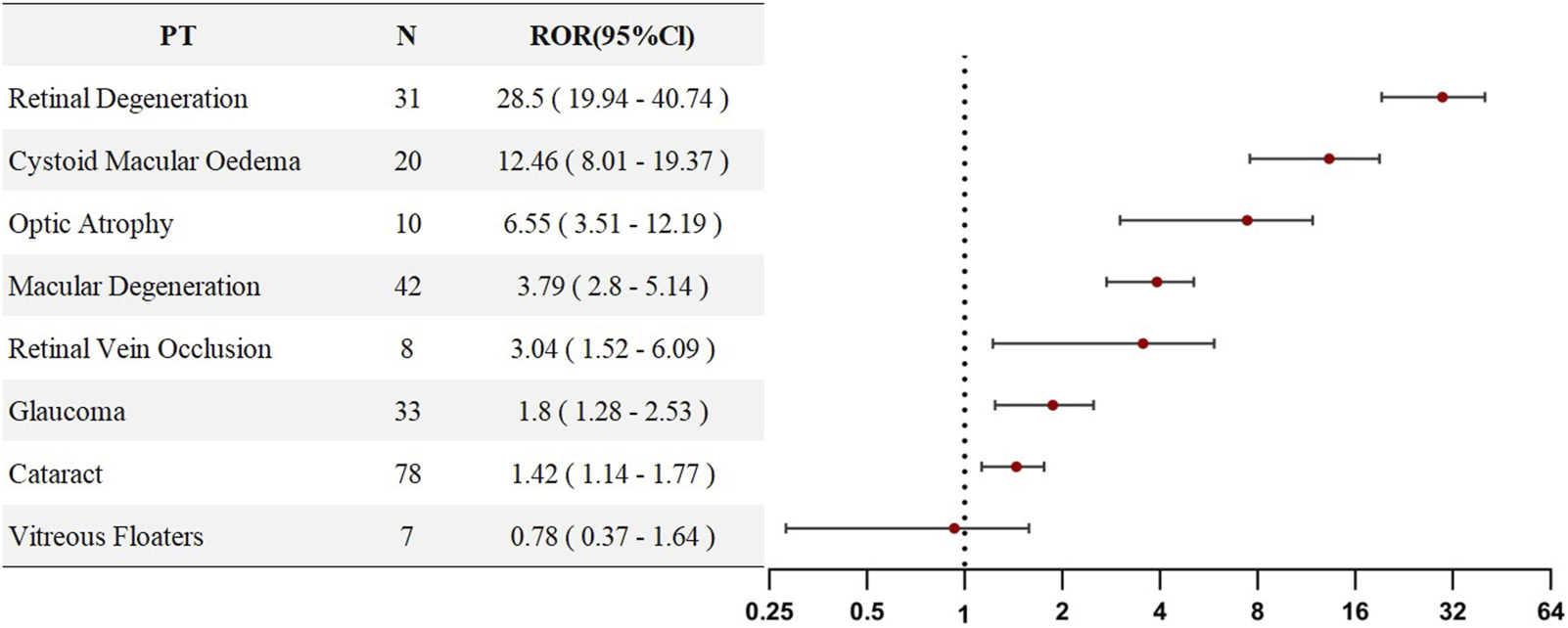 An analysis of adverse events associated with HCQ or CQ was conducted at the Preferred Term (PT) level. The three most frequently reported PTs were cataract (n = 78), macular degeneration (n = 42), and glaucoma (n = 33). Disproportionality analysis of these PTs revealed eight signals with positive associations (ROR >1). All PTs listed in Figure 3 demonstrated statistical significance and are ranked in descending order according to their ROR values. The top three adverse events were retinal degeneration (ROR = 28.5), cystoid macular oedema (ROR = 12.46), and optic atrophy (ROR = 6.55), indicating a strong statistical association between HCQ/CQ use and ocular disorders, particularly retinal diseases. Detailed information is presented in Figure 3.