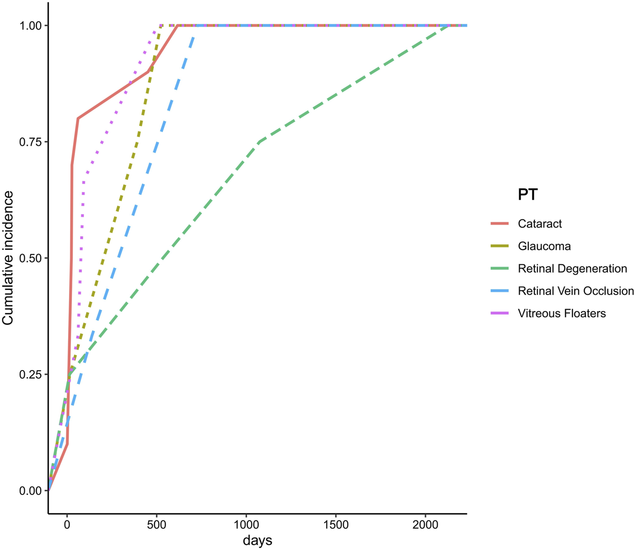 Due to missing data, onset time information was available for only five PTs. The results indicated that cataract had the shortest mean onset time, averaging 125.5 days, whereas retinal degeneration exhibited the longest mean onset time, with an average of 937.5 days (Figure 5).