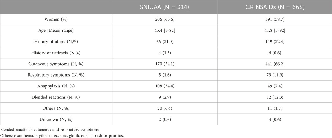 Consequently, the use of alternative drugs to manage hypersensitivity reactions to NSAIDs (HRs) resulted in a 1,142.12% increase in annual costs in 2016 (Cubero et al., 2017). The mean cost of assessing suspected NSAID hypersensitivity in Spain was €239.53 (SD = 140.59) (Sobrino-García et al., 2020). According to the European Academy of Allergy and Clinical Immunology (EAACI), there are five clinical entities, grouped into two main categories based on the underlying mechanism: i) cross-reactive NSAIDs HRs (CRs), and ii) selective NSAIDs HRs (SRs) (Kowalski et al., 2013). The mechanism of CR is non-specifically immunologically mediated and seems to be related to COX inhibition. However, this mechanism is not fully understood. SRs are mediated by a specific immunological mechanism, being induced by a single group of NSAIDs with patients tolerating other chemically unrelated NSAIDs. This category includes two different phenotypes: single-NSAID-induced urticaria/angioedema or anaphylaxis (SNIUAA), mediated by specific IgE antibodies, and single-NSAID-induced delayed reactions (SNIDR), where a T-cell-mediated mechanism is involved (Kowalski et al., 2013).