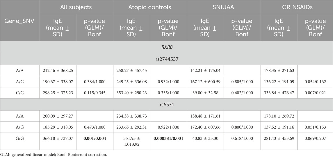 To analyze the genetic associations with serum IgE levels, generalized linear models adjusted by sex were carried out (Table 7). After adjustment for multiple comparisons according to each genetic model, one variant remained statistically associated with serum IgE levels (P-value: 0.021. Thus, CR NSAIDs HRs patients who were homozygous for the mutant allele of the SNV RXRB rs2744537 exhibited higher serum IgE levels. Concerning SNIUAA patients, none of the analyzed SNVs were significantly associated with serum IgE levels. However, the haplotype conformed by the SNVs RXRB rs2744537-rs6531-6:33161660 (A-G-T) showed a significant association with increased serum IgE levels in CR NSAIDs hypersensitivity patients (P-value <0.0001); as well as in SNIUAA patients (P-value <0.0001).